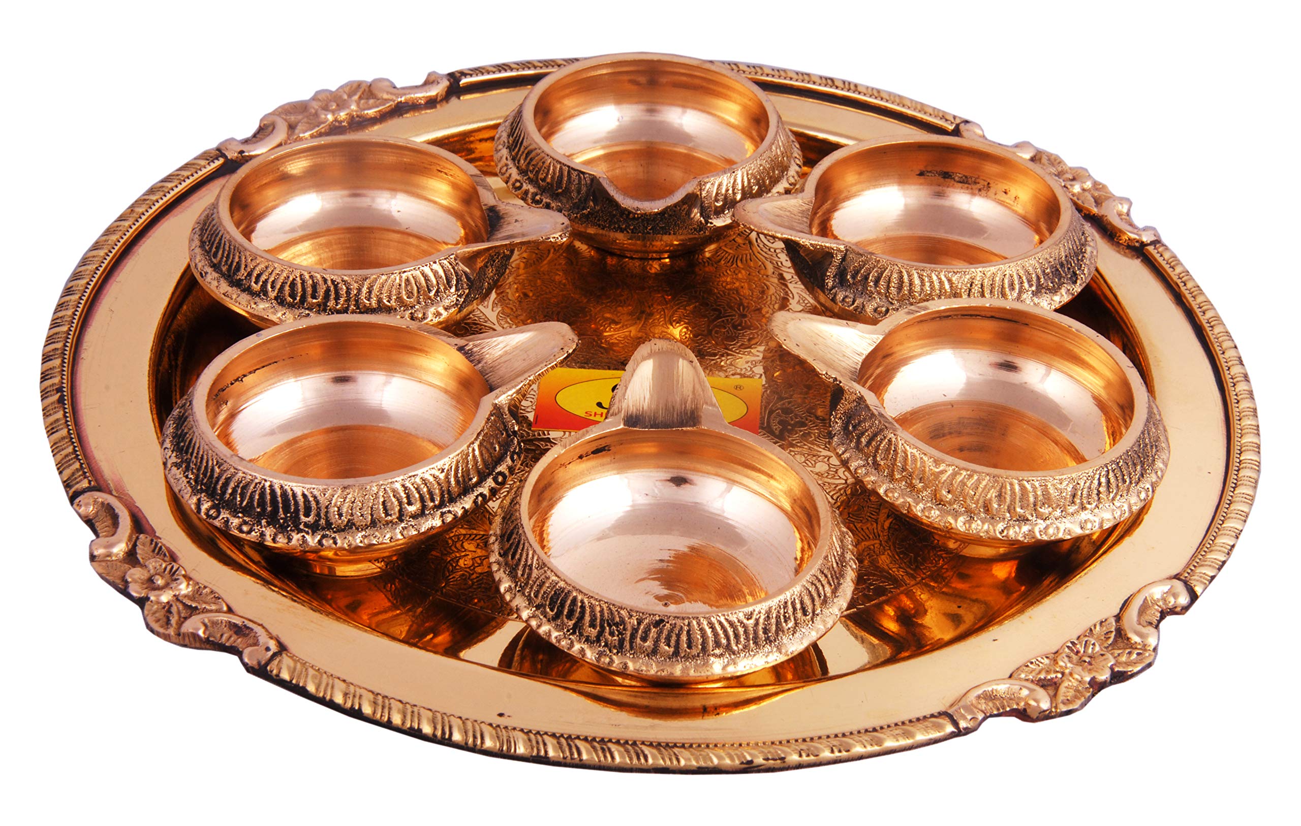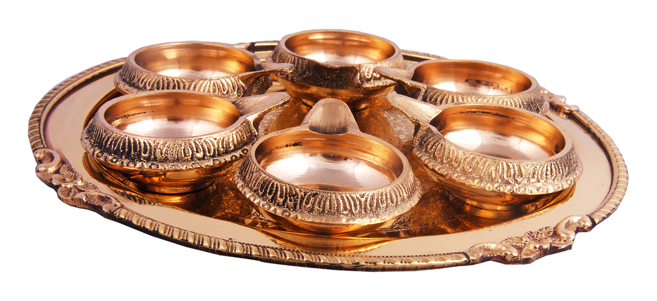 Shiv Shakti Arts Diwali Navratra Spacial Pure Brass Kuber Diya Thali | Pooja Thali Plate Set for Laxmi Ganesh Ji Poojan (7 Pcs = 1 Karvi Quarter Embossed Pooja Plate 6 Kuber Diya) Home/Temple Pooja