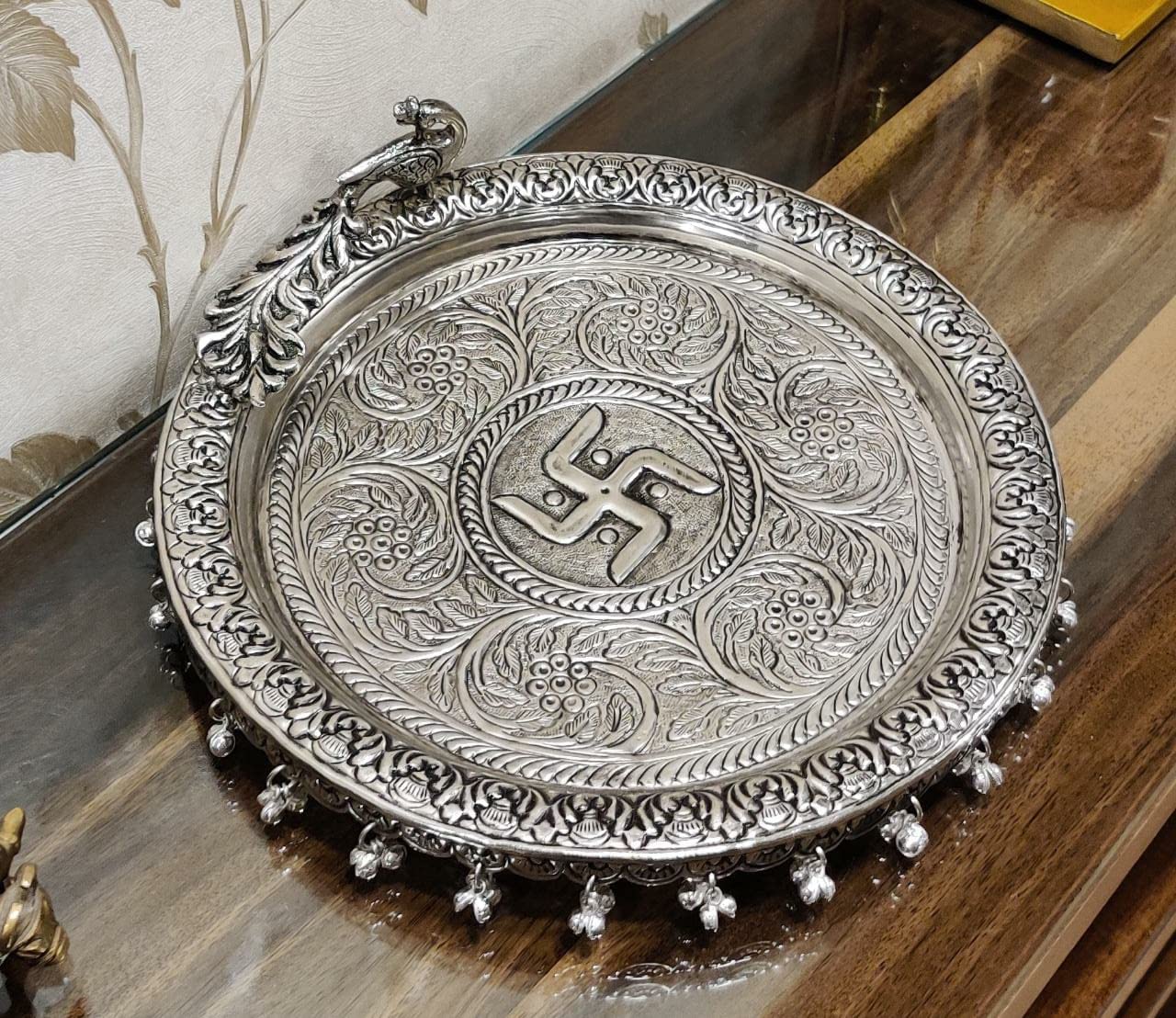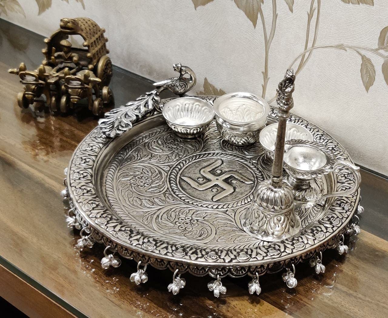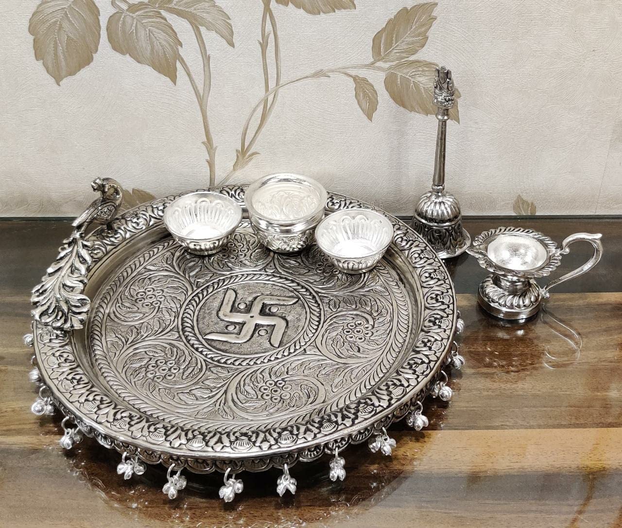 Traditional German Silver Coated Pooja Plate Set Every human being wants to have a Spiritual Connection with their Almighty and Prayer is the best way to have that Spiritual Connection. We try to make those prayers auspicious and as traditional as possible. Product Details: The Pooja Set is made of German Silver Coating and consists of all traditional items used in the Pooja. Benefits: German Silver is one of the materials that humankind has been using for some time. Keeping its benefits in mind and with advanced technology Usage: This Plate Set can be used while performing different Poojas on different occasions like Rakhi Karwa Chauth Diwali Pooja and other Pooja's. Cleaning: For cleaning use a soft sponge and liquid soap. German Siler will maintain its Glossiness. Preservation: German Silver is the friendliest metal in the environment and is easy to recycle making it the greenest natural metal. To make its life longer always dry them after washing with a cotton cloth and keep them in a dry place. If items are not in use store them at a dry place in a dry plastic bag.