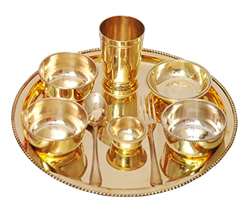 This is a dinnerware thali plate set consists of 1 plate (Thali) 4 bowls 1 tumbler 1 dessert spoon 1 fork knife. In India most of their dishes are served simultaneously in a thali. A thali is a round platter with an eared rim. Entire meals can be served using this simple plate. The thali is generally made with steel or copper. Other dishes served on a thali include vegetables yogurt chutney and pickles. In restaurants vegetarian or meat-based thalis can be served. Thali is delightful ways to enjoy Indian cuisine. It serves a balanced meal in itself and the flavours are so well rounded that palates will certainly be satisfied. Care Tips: - Clean your copperware by hand and avoid dishwasher as the detergent can cause oxidation leading to permanent damage. Use a solution of equal quantities vinegar or lemon juice and salt diluted with some water at such times but don't use it regularly. Also avoid scratchy cleaners like steel wool. A simple soft cleaning liquid on soap base hot water and a soft washing cloth is best for daily use.