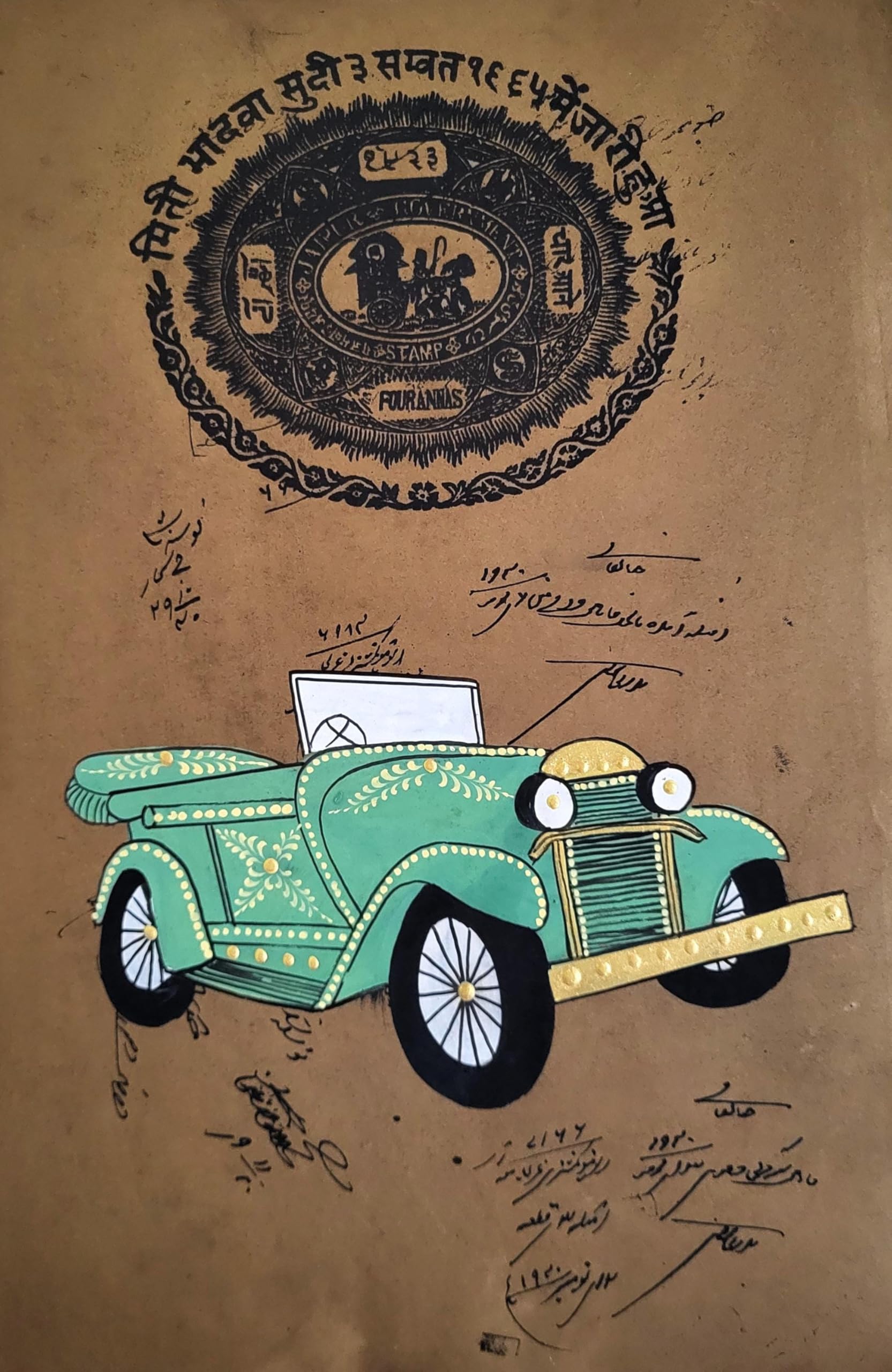 Handmade Indian Miniature painting of Royal Car with Jaipur Government Seal | Vintage stamp paper | Vintage Wall Art