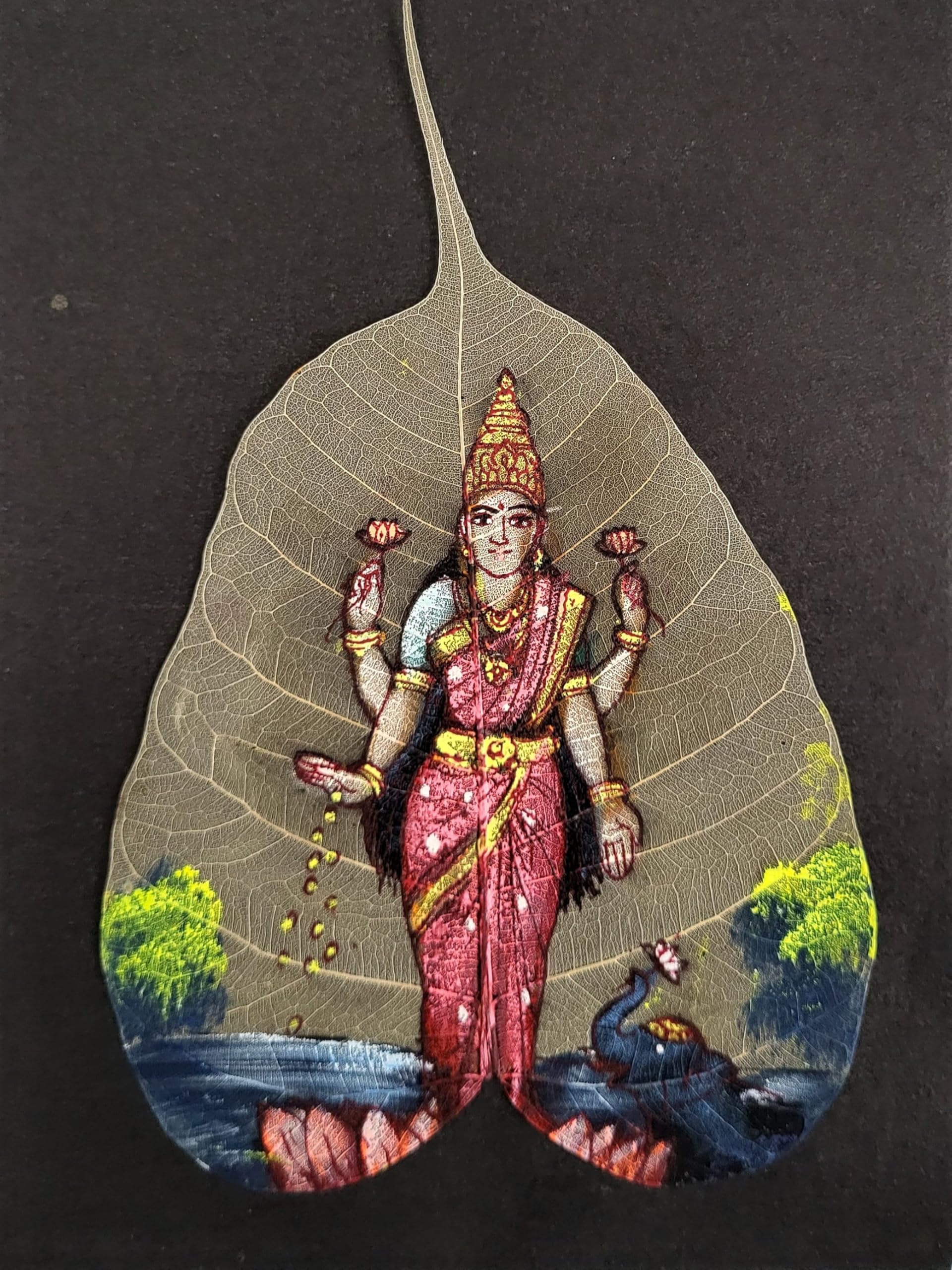 Immerse yourself in the spiritual presence of Goddess Lakshmi with our exquisite handmade painting. On this natural leaf canvas, Lakshmiâthe goddess of wealth and prosperityâgraces us with her divine form. Adorned with lotus flowers, gold jewelry, and a benevolent gaze, she brings blessings and abundance to your space. This unique artwork celebrates devotion and the eternal flow of prosperity. The delicate brushwork and vibrant colors bring out the essence of love and tradition, making it a unique addition to any art collection or home decor. Crafted by skilled artisans, this leaf painting highlights the rich heritage and intricate artistry of India. The natural texture of the Pipal leaf adds an extra layer of depth and authenticity to the piece, making it a truly one-of-a-kind artwork. The traditional attire and tender expressions capture the essence of Indian romance and cultural beauty. This artwork is perfect for those who appreciate unique, handcrafted items that tell a story of cultural significance. It makes a wonderful gift for art lovers, collectors, or anyone looking to add a touch of ethnic elegance to their space. Display it in your living room, bedroom, or gallery to evoke a sense of timeless beauty and romance. Features: Hand-painted on a natural Pipal leaf Detailed portrait of Goddess Laxmi Vibrant, lasting colors Unique blend of nature and art Ideal for home decor, gifts, and art collections Dimensions: 9*6.5 inch Materials: Pipal leaf, natural pigments, traditional painting tools Care Instructions: To preserve the beauty of this delicate leaf painting, keep it away from direct sunlight and moisture. Handle with care and clean gently with a soft, dry cloth. Add this exquisite leaf painting to your collection today and celebrate the timeless beauty of Indian traditional art! Note- It is an unframed painting. Frame is just for reference and it is not included.