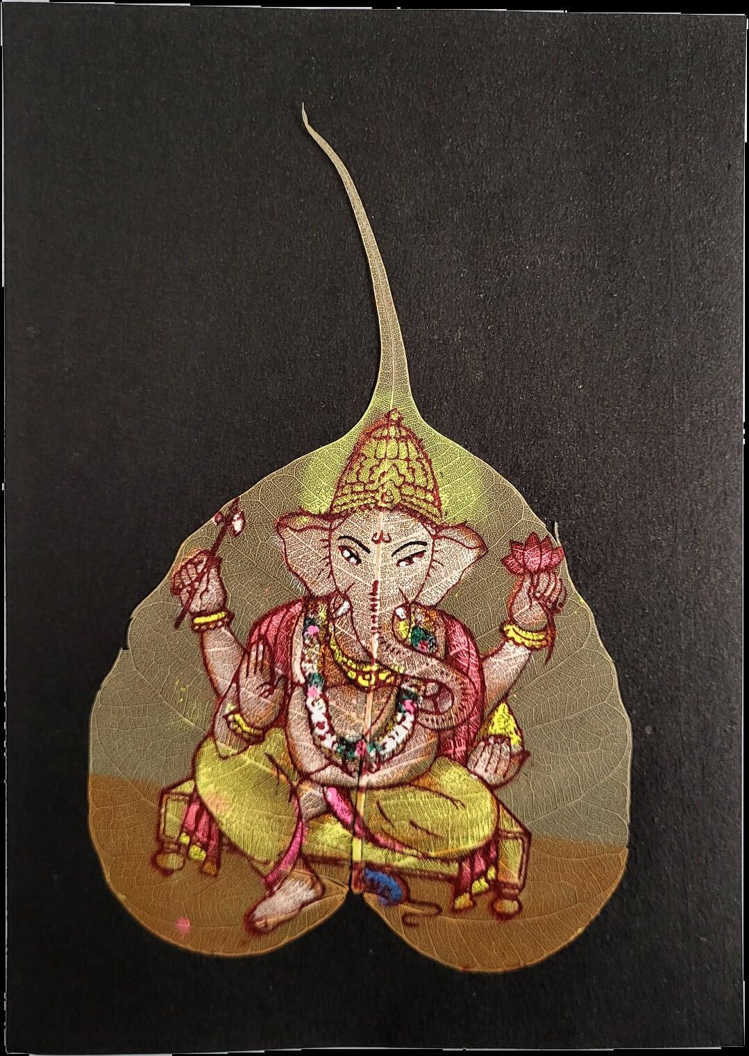 INSAIN - Divine Guardian - Hand-Painted Ganesh Leaf Art- Indian Leaf Painting - Pipal Leaf Art (9 * 6.5 inch)- Wall Decor | Ganesh 2