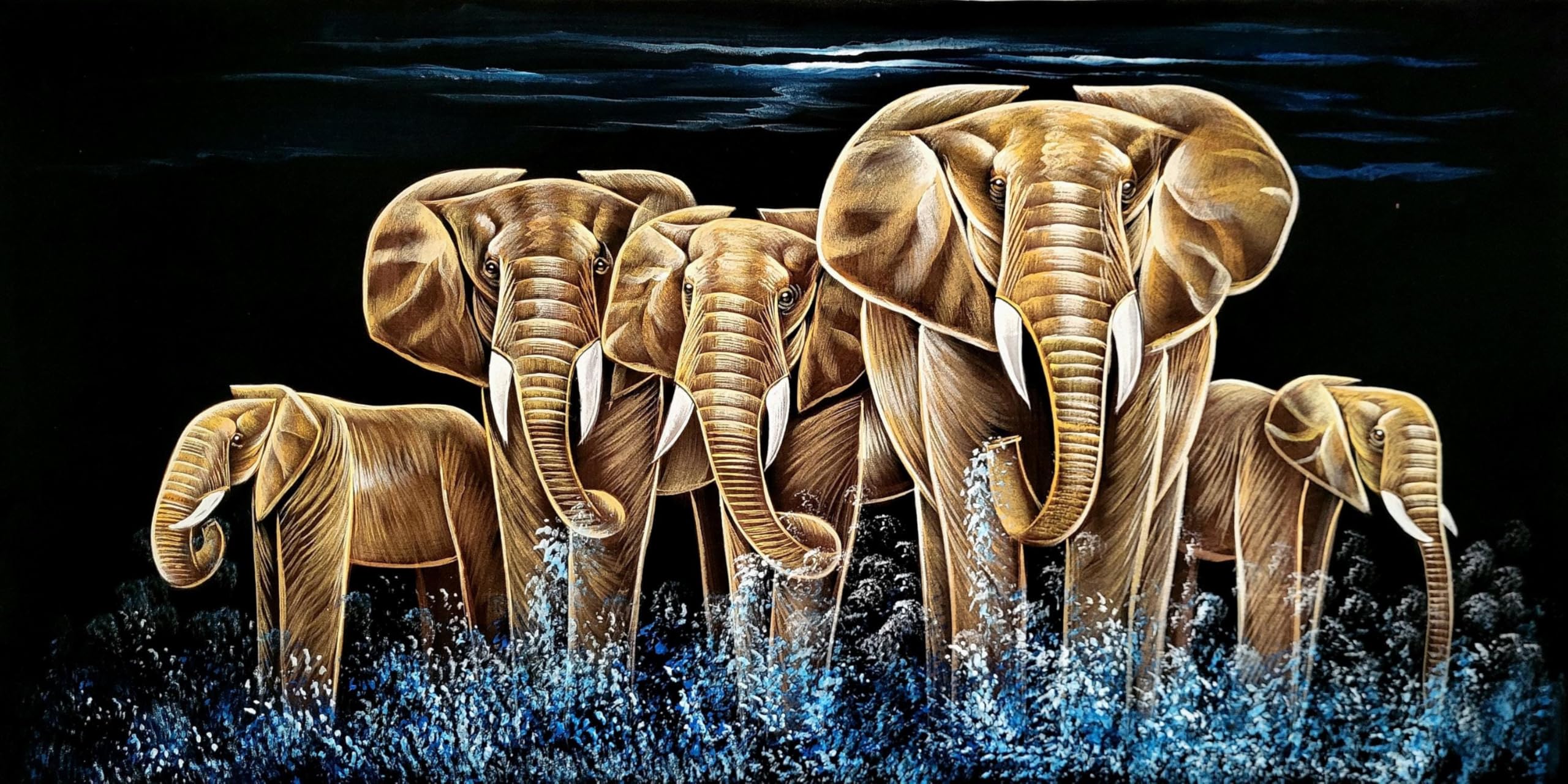 Immerse yourself in the majestic beauty of the wild with this stunning handmade velvet painting depicting a serene Elephant family. This artwork captures the essence of wildlife with a mother Elephant and her cubs resting amidst lush greenery and a tranquil night sky. The painting is meticulously crafted on luxurious velvet, enhancing the rich colors and intricate details of the Elephants and the natural surroundings. The vibrant hues and lifelike portrayal bring the scene to life, making it a captivating piece for any wildlife enthusiast or art lover. Perfect for adding a touch of nature to your living space, this piece can be a focal point in your living room, study, or any space where you seek a connection with the natural world. It serves as a reminder of the beauty and harmony of wildlife, offering a sense of tranquility and admiration for these magnificent creatures. Features: Handmade painting on high-quality velvet Detailed depiction of a Elephant family in a natural setting Vibrant colors and intricate details on a rich, textured backdrop Ideal for nature-themed and wildlife-inspired spaces Unique blend of traditional art and wildlife elements Dimensions: Height: 60 cm Width: 122cm Materials: Velvet fabric Natural pigments Traditional painting tools Care Instructions: To maintain the beauty and integrity of this velvet painting, avoid exposure to direct sunlight and moisture. Handle with care and clean gently with a soft, dry cloth. Bring home this beautiful piece of wildlife art and let the majestic presence of the Elephant family enrich your living space. This handcrafted velvet painting is a testament to traditional Indian artistry and the awe-inspiring beauty of nature, making it a cherished addition to your collection.