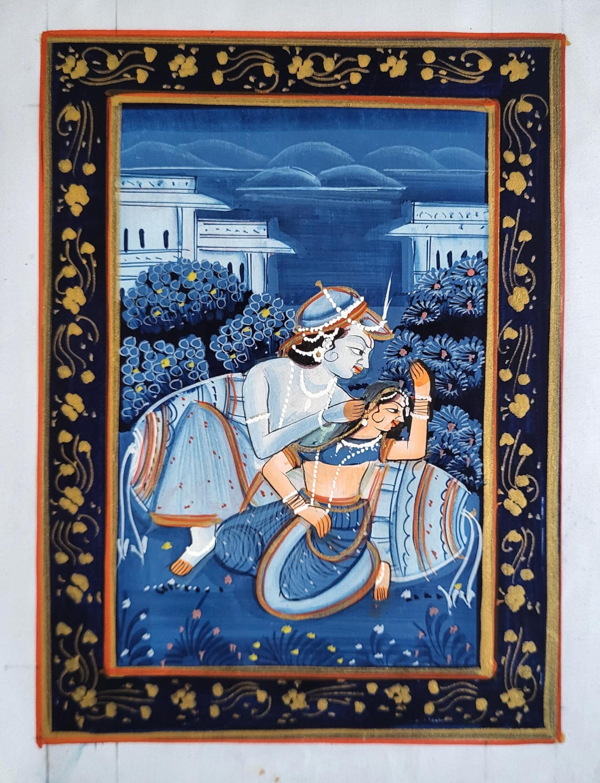 Immerse yourself in the divine love story of Radha and Krishna with our exquisite handmade painting. Capturing the enchanting Ras Leela, this artwork portrays the eternal dance of love between the soul and the divine. Radha's devotion and Krishna's playful flute melodies come alive on the canvas, inviting you to experience their timeless bond. Painted meticulously on a fabric, the delicate brushwork and vibrant colors bring out the essence of love and tradition, making it a unique addition to any art collection or home decor. Crafted by skilled artisans, this fabric painting highlights the rich heritage and intricate artistry of India. The natural texture of the fabric adds an extra layer of depth and authenticity to the piece, making it a truly one-of-a-kind artwork. The traditional attire and tender expressions capture the essence of Indian romance and cultural beauty. This artwork is perfect for those who appreciate unique, handcrafted items that tell a story of cultural significance. It makes a wonderful gift for art lovers, collectors, or anyone looking to add a touch of ethnic elegance to their space. Display it in your living room, bedroom, or gallery to evoke a sense of timeless beauty and romance. Features: Hand-painted on a natural fabric Detailed portrait of Radha Krishna Ras Leela Vibrant, lasting colors Unique blend of nature and art Ideal for home decor, gifts, and art collections Dimensions: 9*6.5 inch Materials: Fabric, natural pigments, traditional painting tools Care Instructions: To preserve the beauty of this fabric painting, keep it away from direct sunlight and moisture. Handle with care and clean gently with a soft, dry cloth. Add this exquisite fabric painting to your collection today and celebrate the timeless beauty of Indian traditional art!