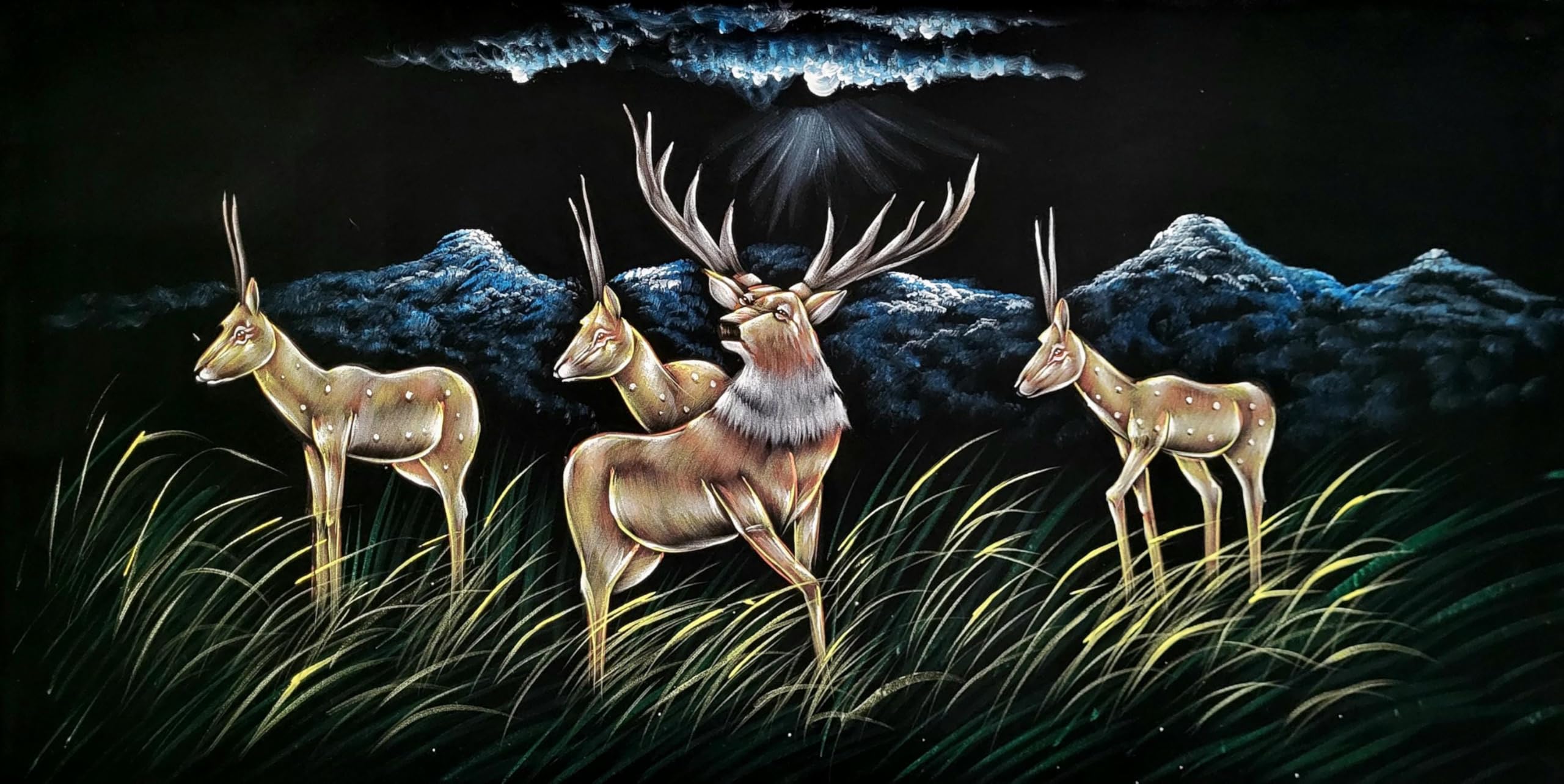 Elevate your home decor with this breathtaking handmade velvet painting, featuring a serene scene of gazelles deer by a moonlit river. Measuring 122 cm in height and 60 cm in width, this captivating artwork showcases the elegance of gazelles grazing along the riverbank under the gentle glow of the moon. The rich, vibrant colors and intricate details are expertly rendered on high-quality velvet, providing a luxurious texture and depth that will enhance any room. Perfect for admirers of wildlife and unique, handcrafted art, this painting makes a unique addition to your living room, study, or office.