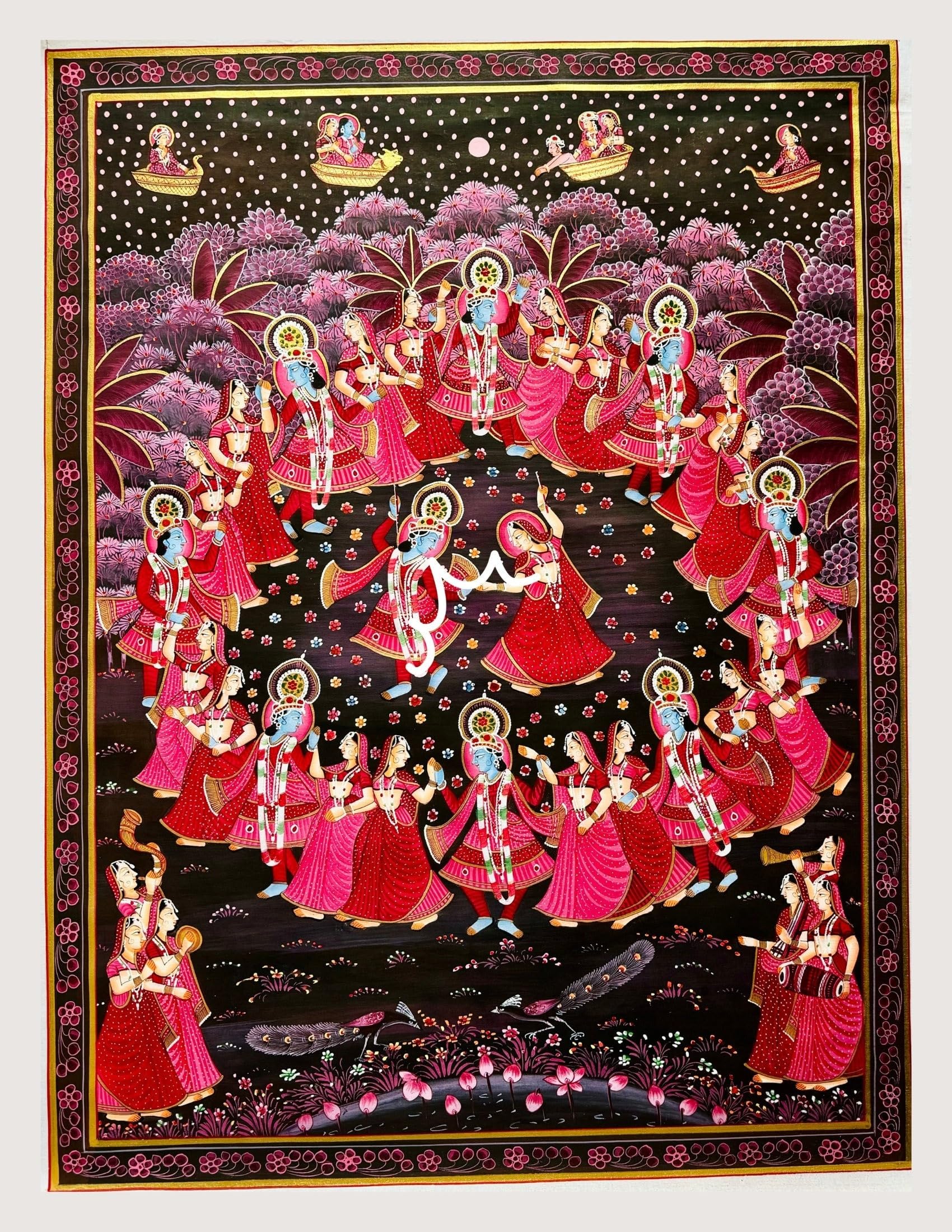 Step into the divine dance of love and devotion with this exquisite handmade cotton painting depicting the Raas Leela. This artwork portrays Lord Krishna dancing with the Gopis under the moonlit night, a scene rich in spiritual significance and cultural heritage. The vibrant colors and intricate details bring the festive atmosphere and joyous expressions of the characters to life. Crafted on high-quality cotton, this painting reflects the traditional artistry and meticulous craftsmanship of Indian artists. The delicate brushstrokes and vivid hues enhance the dynamic movements and lively expressions, creating a captivating visual narrative that celebrates the divine love of Krishna and the Gopis. This piece is perfect for adding a touch of Indian culture and spirituality to your living space. Whether placed in a living room, meditation space, or cultural center, it serves as a reminder of the joyous and divine aspects of life, offering a sense of peace and celebration. Features: Handmade painting on premium cotton fabric Depicts the traditional Raas Leela scene with Krishna and Gopis Vibrant colors and detailed artistry Ideal for cultural and spiritual decor Reflects traditional Indian craftsmanship and heritage Dimensions: Height: 110 cm Width: 85 cm Materials: Cotton fabric Natural pigments Traditional painting tools Care Instructions: To preserve the beauty and quality of this cotton painting, avoid exposure to direct sunlight and moisture. Handle with care and clean gently with a soft, dry cloth. Embrace the enchanting world of Raas Leela with this handmade cotton painting. It is a beautiful addition to any space, bringing a touch of divine love, cultural richness, and artistic elegance to your home. Note- It is an unframed painting. Frame is just for reference and it is not included.