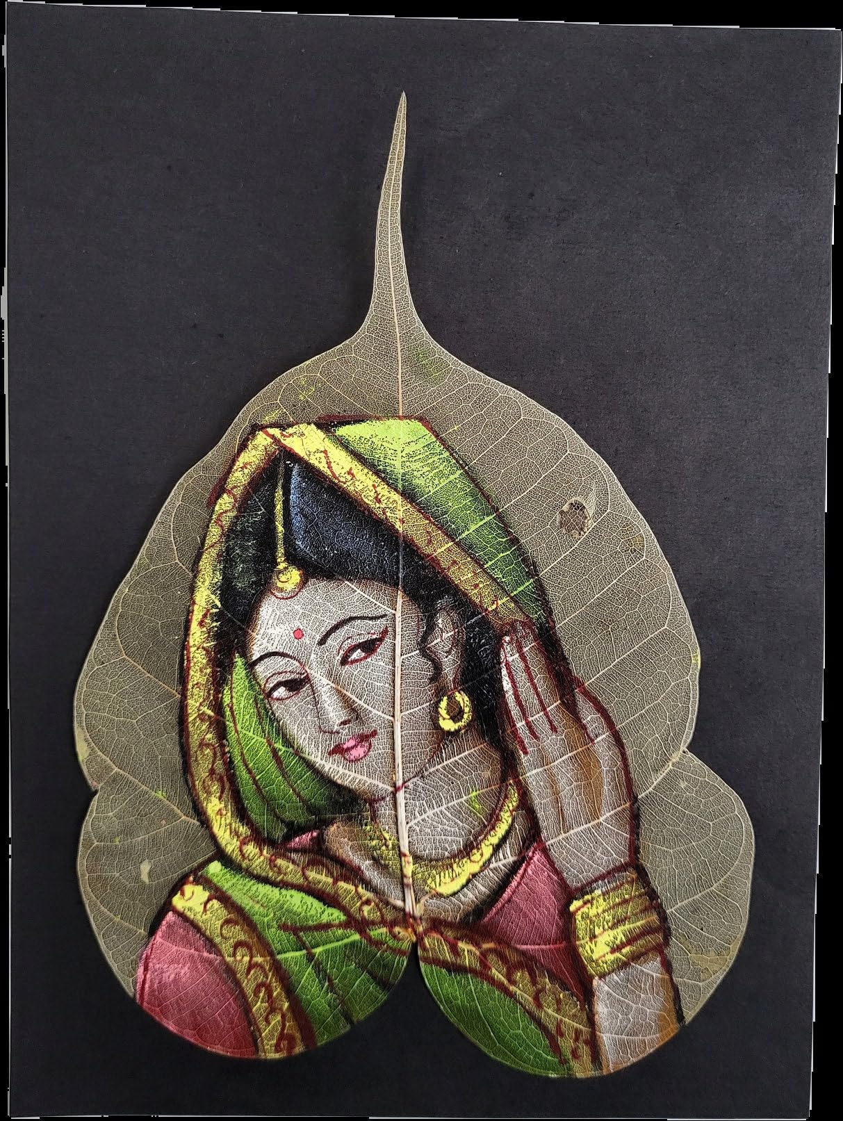 INSAIN - Handmade Indian Leaf Painting - Traditional Woman Portrait - Pipal Leaf Art (9 * 6.5 inch) | Women