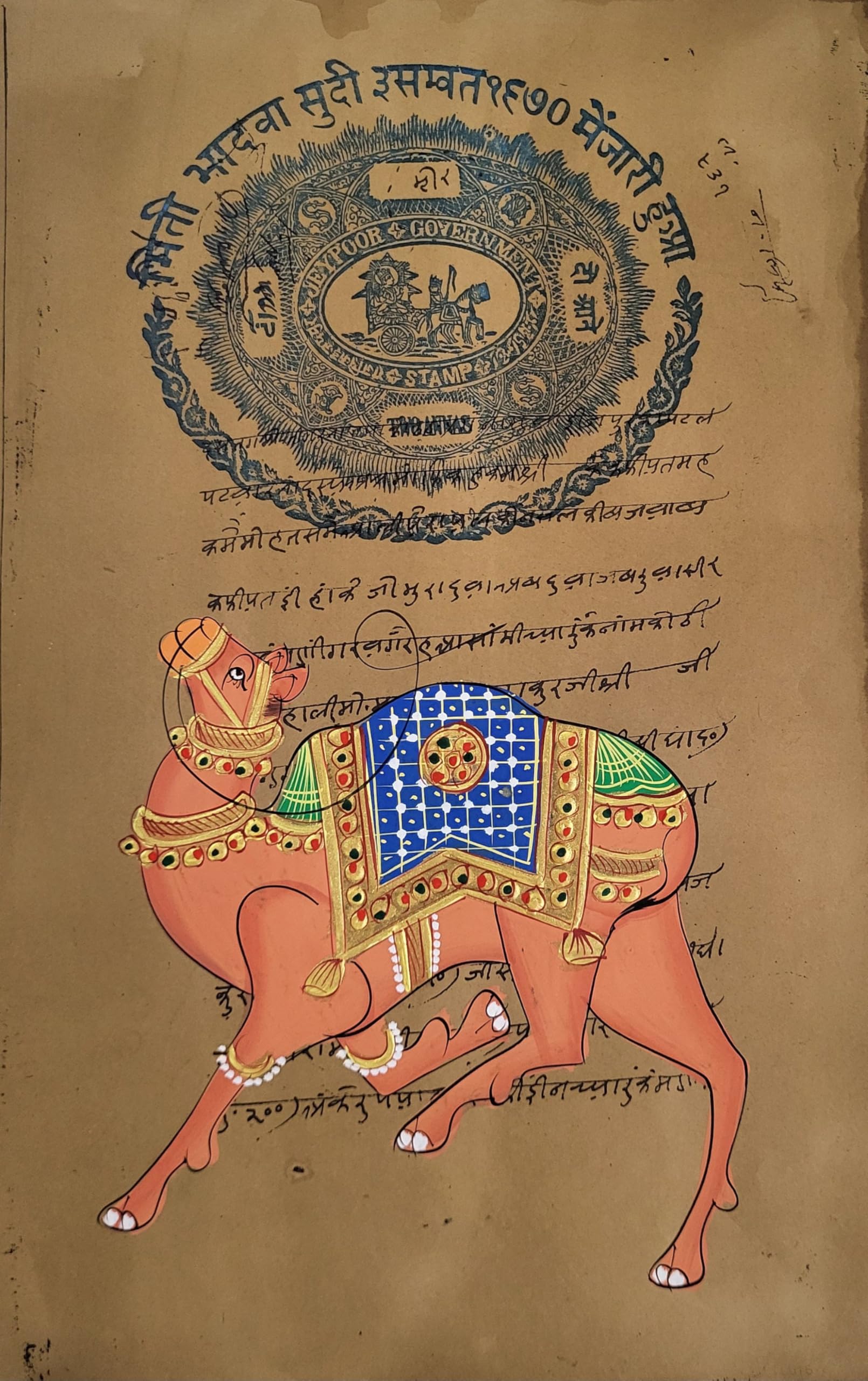 INSAIN - Handmade Indian Miniature painting of Decorative Royal Camels with Jaipur Government Seal | Vintage stamp paper | Vintage Wall Art | Camel
