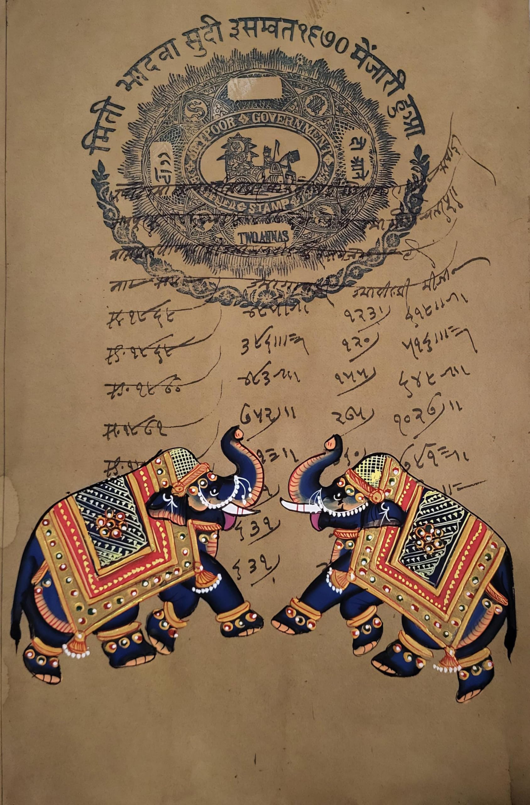 INSAIN - Handmade Indian Miniature painting of Decorative Royal Elephants with Jaipur Government Seal | Vintage stamp paper | Vintage Wall Art | Elephant 6