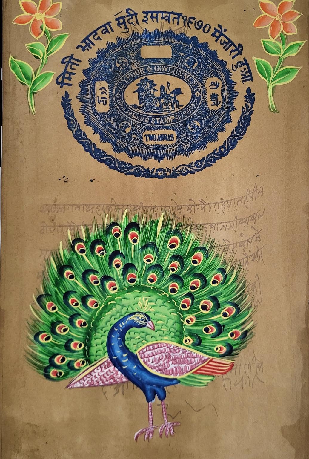 INSAIN - Handmade Indian Miniature painting of Majestic Peacock on Vintage stamp paper | Jaipur Royal Family Seal | Vintage Wall Art | Peacock 3