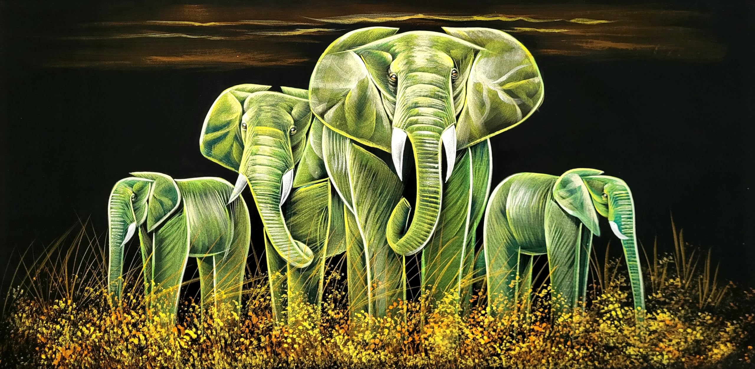 Immerse yourself in the majestic beauty of the wild with this stunning handmade velvet painting depicting a serene Elephant family. This artwork captures the essence of wildlife with a mother Elephant and her cubs resting amidst lush greenery and a tranquil night sky. The painting is meticulously crafted on luxurious velvet, enhancing the rich colors and intricate details of the Elephants and the natural surroundings. The vibrant hues and lifelike portrayal bring the scene to life, making it a captivating piece for any wildlife enthusiast or art lover. Perfect for adding a touch of nature to your living space, this piece can be a focal point in your living room, study, or any space where you seek a connection with the natural world. It serves as a reminder of the beauty and harmony of wildlife, offering a sense of tranquility and admiration for these magnificent creatures. Features: Handmade painting on high-quality velvet Detailed depiction of a Elephant family in a natural setting Vibrant colors and intricate details on a rich, textured backdrop Ideal for nature-themed and wildlife-inspired spaces Unique blend of traditional art and wildlife elements Dimensions: Height: 60 cm Width: 122cm Materials: Velvet fabric Natural pigments Traditional painting tools Care Instructions: To maintain the beauty and integrity of this velvet painting, avoid exposure to direct sunlight and moisture. Handle with care and clean gently with a soft, dry cloth. Bring home this beautiful piece of wildlife art and let the majestic presence of the Elephant family enrich your living space. This handcrafted velvet painting is a testament to traditional Indian artistry and the awe-inspiring beauty of nature, making it a cherished addition to your collection.