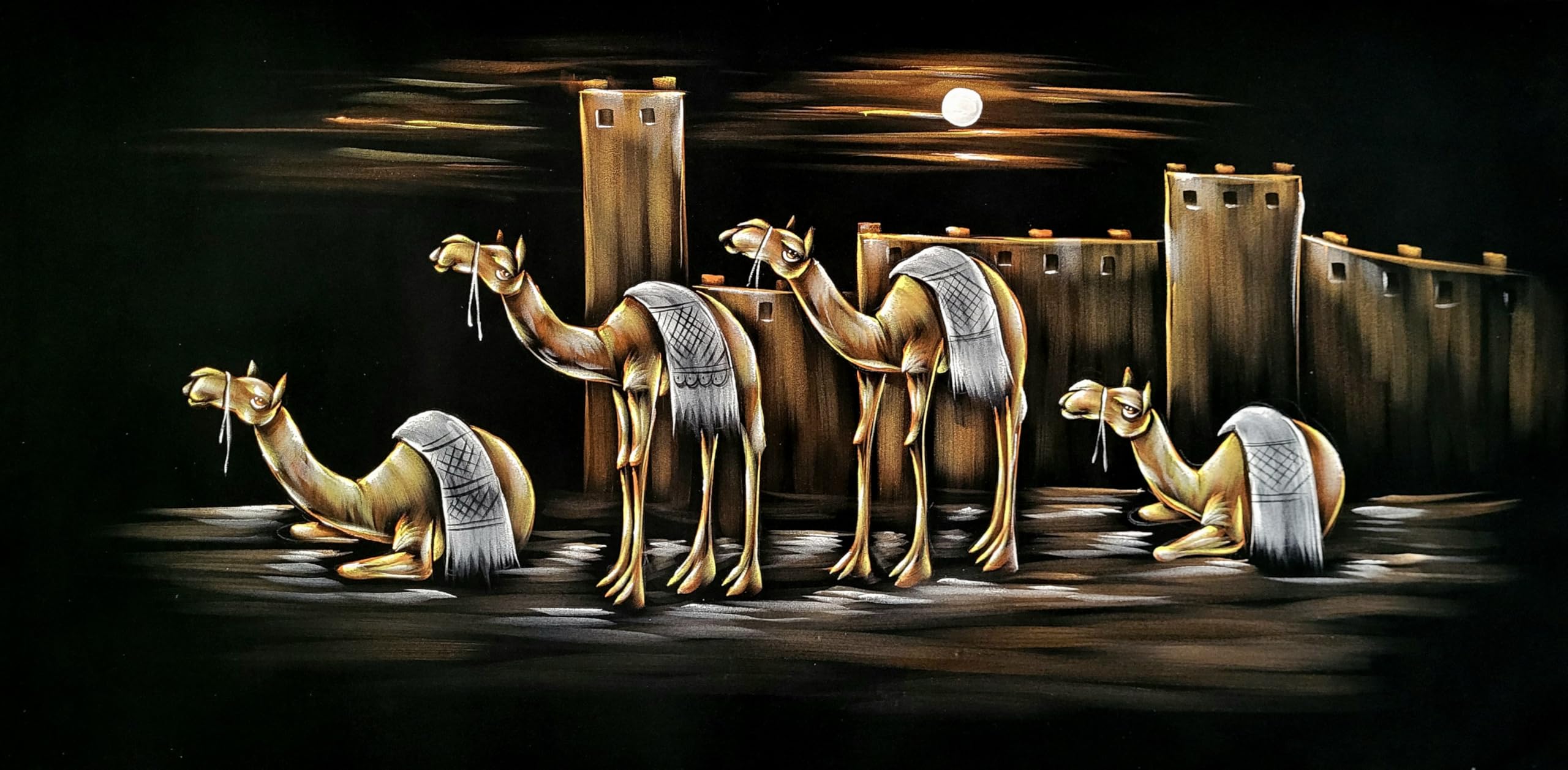 Immerse yourself in the timeless beauty of the desert with this exquisite handmade velvet painting, featuring an authentic Arabic touch. Measuring 122 cm in height and 60 cm in width, this stunning piece captures a serene camel caravan journeying through a tranquil desert oasis under a starlit sky. The intricate details, including traditional Arabic architecture and palm trees, along with the rich, vibrant colors of this painting, are masterfully crafted on high-quality velvet, providing a luxurious texture and depth that will add elegance to any room. Ideal for lovers of Middle Eastern landscapes and unique, handcrafted art, this painting is perfect for your living room, study, or office.