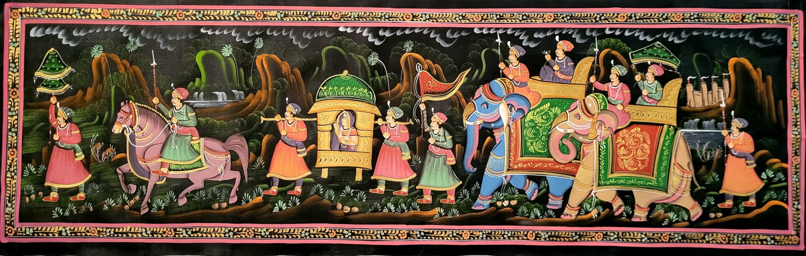 Capture the essence of regal splendor with this handmade polyester painting depicting a traditional royal procession. This stunning artwork portrays a vibrant parade featuring noble figures on elephants, horses, and camels, accompanied by attendants in colorful attire, set against a backdrop of lush landscapes and historical architecture. The detailed brushwork and vivid colors bring this historical scene to life, reflecting the opulence and cultural richness of traditional Indian royalty. Crafted on high-quality polyester fabric, this painting showcases the traditional artistry and meticulous craftsmanship of Indian artists. The intricate details highlight the elaborate costumes, the regal demeanor of the figures, and the festive atmosphere of the procession. This piece is perfect for adding a touch of Indian culture and history to your living space. Whether placed in a living room, study, or cultural center, it serves as a reminder of the royal heritage and artistic elegance of India. Features: Handmade painting on premium polyester fabric Depicts a traditional royal procession with elephants, horses, and camels Vibrant colors and detailed artistry Ideal for cultural and historical decor Reflects traditional Indian craftsmanship and heritage Dimensions: Height: 36 cm Width: 150 cm Materials: Polyester fabric Natural pigments Traditional painting tools Care Instructions: To preserve the beauty and quality of this polyester painting, avoid exposure to direct sunlight and moisture. Handle with care and clean gently with a soft, dry cloth. Celebrate the opulence and grandeur of Indian royalty with this handmade polyester painting. It is a beautiful addition to any space, bringing a touch of cultural richness and historical elegance to your home.