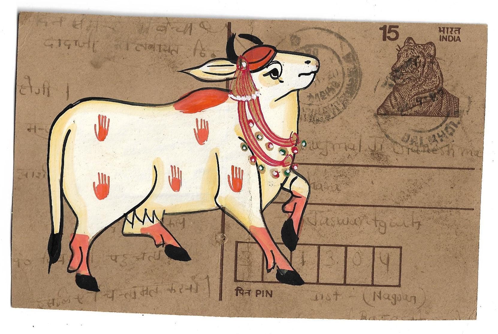 INSAIN - Holy Indian Cow Paintings on Vintage Indian Postcard Front | Holy Indian Cow
