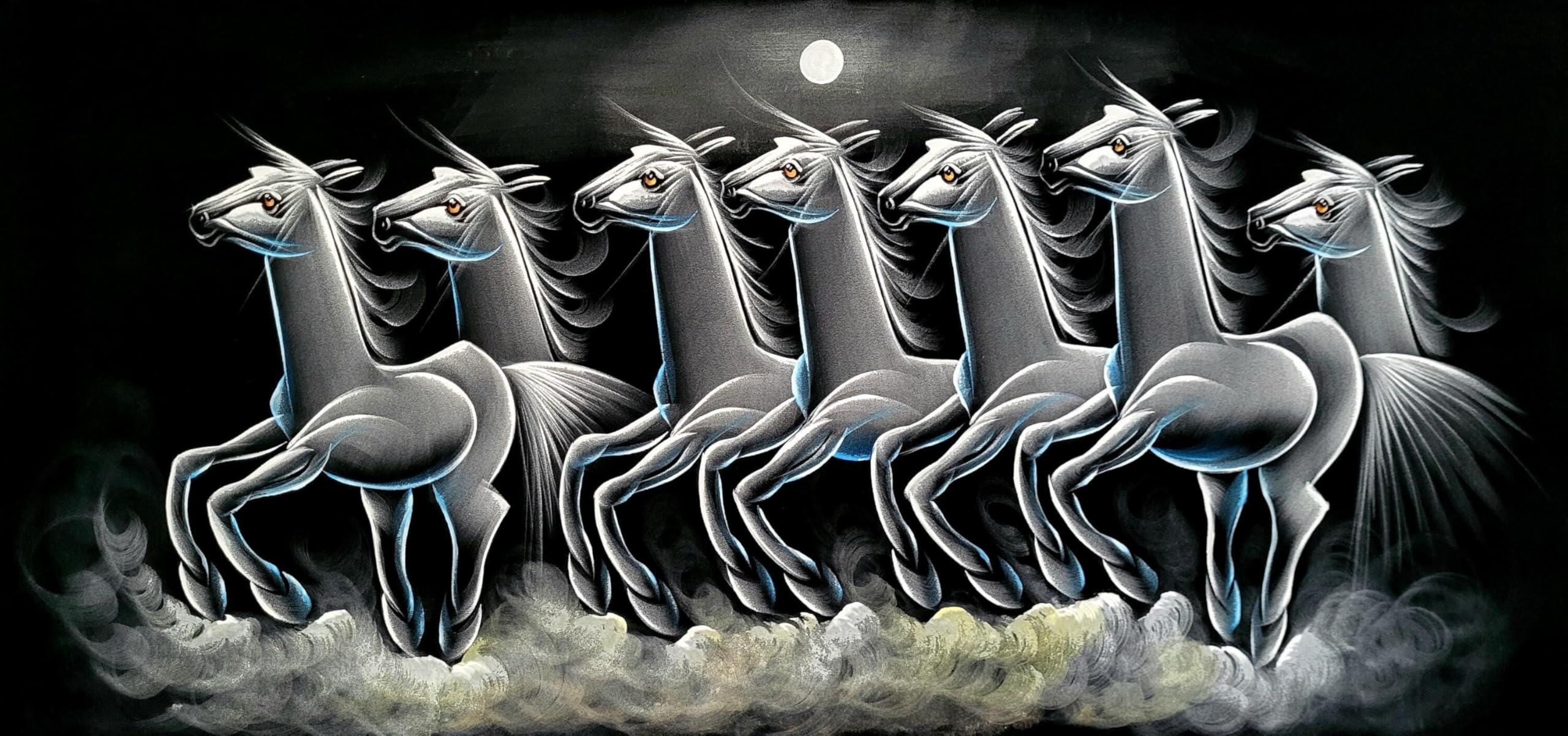 Immerse yourself in the majestic beauty of the wild with this stunning handmade velvet painting depicting a serene Horse family. This artwork captures the essence of wildlife with horses resting amidst lush greenery and a tranquil night sky. The painting is meticulously crafted on luxurious velvet, enhancing the rich colors and intricate details of the Horses and the natural surroundings. The vibrant hues and lifelike portrayal bring the scene to life, making it a captivating piece for any wildlife enthusiast or art lover. Perfect for adding a touch of nature to your living space, this piece can be a focal point in your living room, study, or any space where you seek a connection with the natural world. It serves as a reminder of the beauty and harmony of wildlife, offering a sense of tranquility and admiration for these magnificent creatures. Features: Handmade painting on high-quality velvet Detailed depiction of a Horse family in a natural setting Vibrant colors and intricate details on a rich, textured backdrop Ideal for nature-themed and wildlife-inspired spaces Unique blend of traditional art and wildlife elements Dimensions: Height: 60 cm Width: 122cm Materials: Velvet fabric Natural pigments Traditional painting tools Care Instructions: To maintain the beauty and integrity of this velvet painting, avoid exposure to direct sunlight and moisture. Handle with care and clean gently with a soft, dry cloth. Bring home this beautiful piece of wildlife art and let the majestic presence of the Horse family enrich your living space. This handcrafted velvet painting is a testament to traditional Indian artistry and the awe-inspiring beauty of nature, making it a cherished addition to your collection.