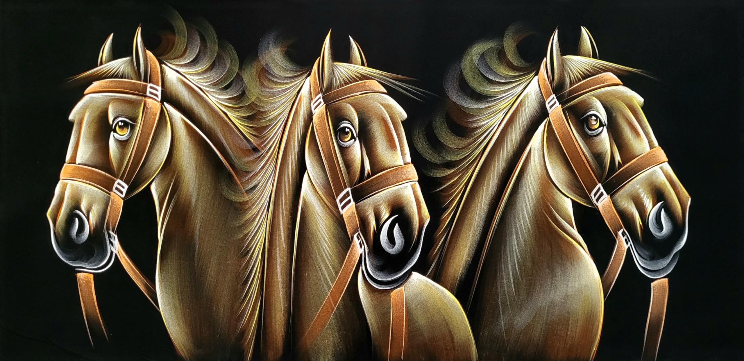 Immerse yourself in the majestic beauty of the wild with this stunning handmade velvet painting depicting a serene Horse family. This artwork captures the essence of wildlife with horses resting amidst lush greenery and a tranquil night sky. The painting is meticulously crafted on luxurious velvet, enhancing the rich colors and intricate details of the Horses and the natural surroundings. The vibrant hues and lifelike portrayal bring the scene to life, making it a captivating piece for any wildlife enthusiast or art lover. Perfect for adding a touch of nature to your living space, this piece can be a focal point in your living room, study, or any space where you seek a connection with the natural world. It serves as a reminder of the beauty and harmony of wildlife, offering a sense of tranquility and admiration for these magnificent creatures. Features: Handmade painting on high-quality velvet Detailed depiction of a Horse family in a natural setting Vibrant colors and intricate details on a rich, textured backdrop Ideal for nature-themed and wildlife-inspired spaces Unique blend of traditional art and wildlife elements Dimensions: Height: 60 cm Width: 122cm Materials: Velvet fabric Natural pigments Traditional painting tools Care Instructions: To maintain the beauty and integrity of this velvet painting, avoid exposure to direct sunlight and moisture. Handle with care and clean gently with a soft, dry cloth. Bring home this beautiful piece of wildlife art and let the majestic presence of the Horse family enrich your living space. This handcrafted velvet painting is a testament to traditional Indian artistry and the awe-inspiring beauty of nature, making it a cherished addition to your collection.