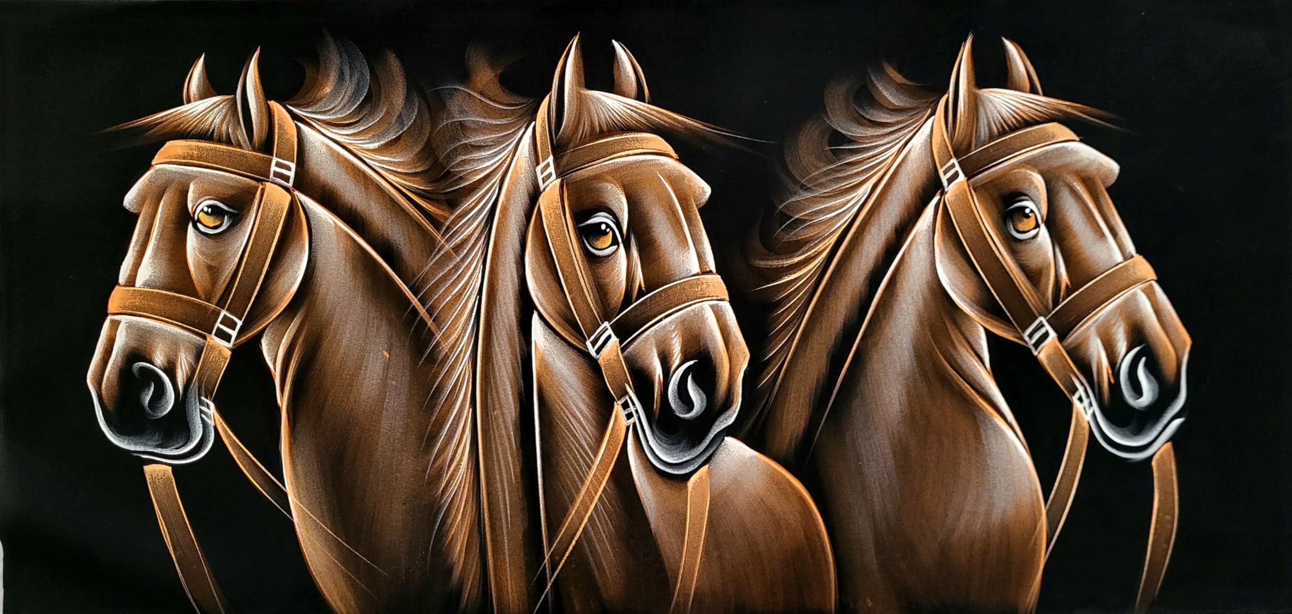 Immerse yourself in the majestic beauty of the wild with this stunning handmade velvet painting depicting a serene Horse family. This artwork captures the essence of wildlife with horses resting amidst lush greenery and a tranquil night sky. The painting is meticulously crafted on luxurious velvet, enhancing the rich colors and intricate details of the Horses and the natural surroundings. The vibrant hues and lifelike portrayal bring the scene to life, making it a captivating piece for any wildlife enthusiast or art lover. Perfect for adding a touch of nature to your living space, this piece can be a focal point in your living room, study, or any space where you seek a connection with the natural world. It serves as a reminder of the beauty and harmony of wildlife, offering a sense of tranquility and admiration for these magnificent creatures. Features: Handmade painting on high-quality velvet Detailed depiction of a Horse family in a natural setting Vibrant colors and intricate details on a rich, textured backdrop Ideal for nature-themed and wildlife-inspired spaces Unique blend of traditional art and wildlife elements Dimensions: Height: 60 cm Width: 122cm Materials: Velvet fabric Natural pigments Traditional painting tools Care Instructions: To maintain the beauty and integrity of this velvet painting, avoid exposure to direct sunlight and moisture. Handle with care and clean gently with a soft, dry cloth. Bring home this beautiful piece of wildlife art and let the majestic presence of the Horse family enrich your living space. This handcrafted velvet painting is a testament to traditional Indian artistry and the awe-inspiring beauty of nature, making it a cherished addition to your collection.