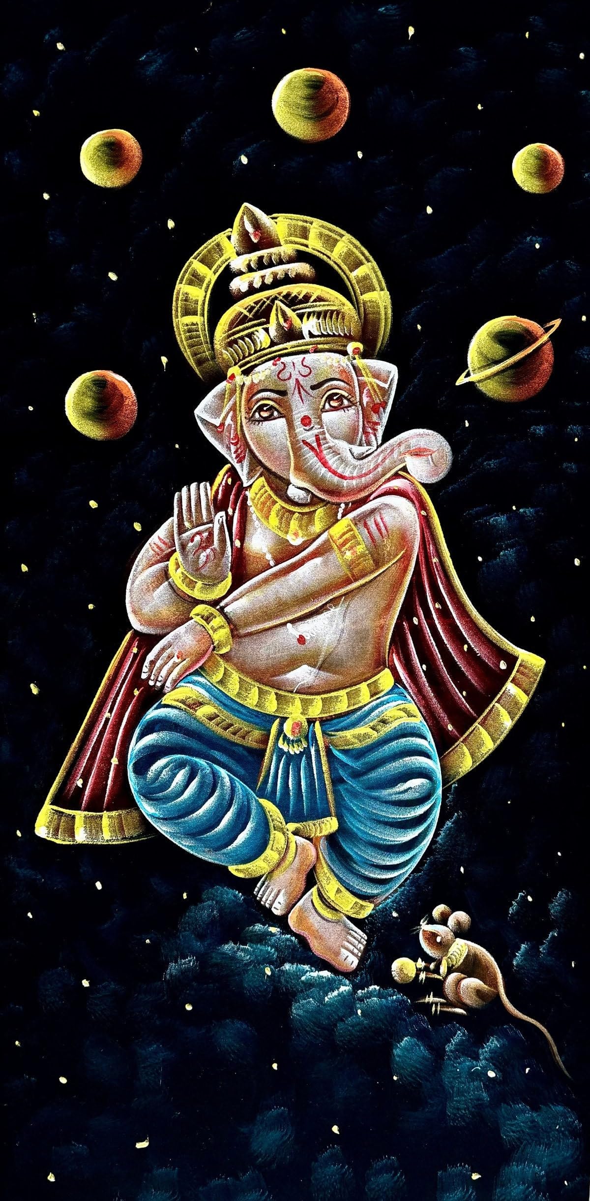 Immerse yourself in the divine energy of traditional Indian art with this striking handmade painting of Lord Ganesha, meticulously crafted on luxurious velvet. This artwork embodies the cosmic dance of Ganesha, representing the cycle of creation, preservation, and destruction, integral to Hindu philosophy. The detailed calligraphy in the background adds an authentic touch, showcasing ancient Indian script that enhances the overall spiritual significance of the piece. The use of bold colors and meticulous detailing highlights the artist's exceptional skill and dedication to preserving traditional Indian art forms. The velvet canvas provides a rich, textured backdrop that enhances the vibrant colors and intricate details, making the artwork truly stand out. Ideal for spiritual seekers, art collectors, and anyone with an appreciation for traditional Indian art, this piece will add a touch of mystical elegance and cultural depth to any space. Display it in your meditation room, living area, or personal sanctuary to evoke a sense of spiritual introspection and cultural richness. Features: Handmade painting on luxurious velvet Intricate symbols and calligraphy Vivid, lasting colors on a rich, textured backdrop A unique blend of spiritual and cultural elements Ideal for private collections, home decor, and spiritual spaces Dimensions: 122x60 cm Materials: Velvet fabric, natural pigments, traditional painting tools Care Instructions: To maintain the beauty and integrity of this velvet painting, avoid exposure to direct sunlight and moisture. Handle with care and clean gently with a soft, dry cloth. Bring home this beautiful piece of traditional Indian art and immerse yourself in the rich spiritual heritage of India. This handcrafted velvet painting is sure to be a cherished addition to your collection, symbolizing the profound philosophical and artistic traditions of Indian culture.