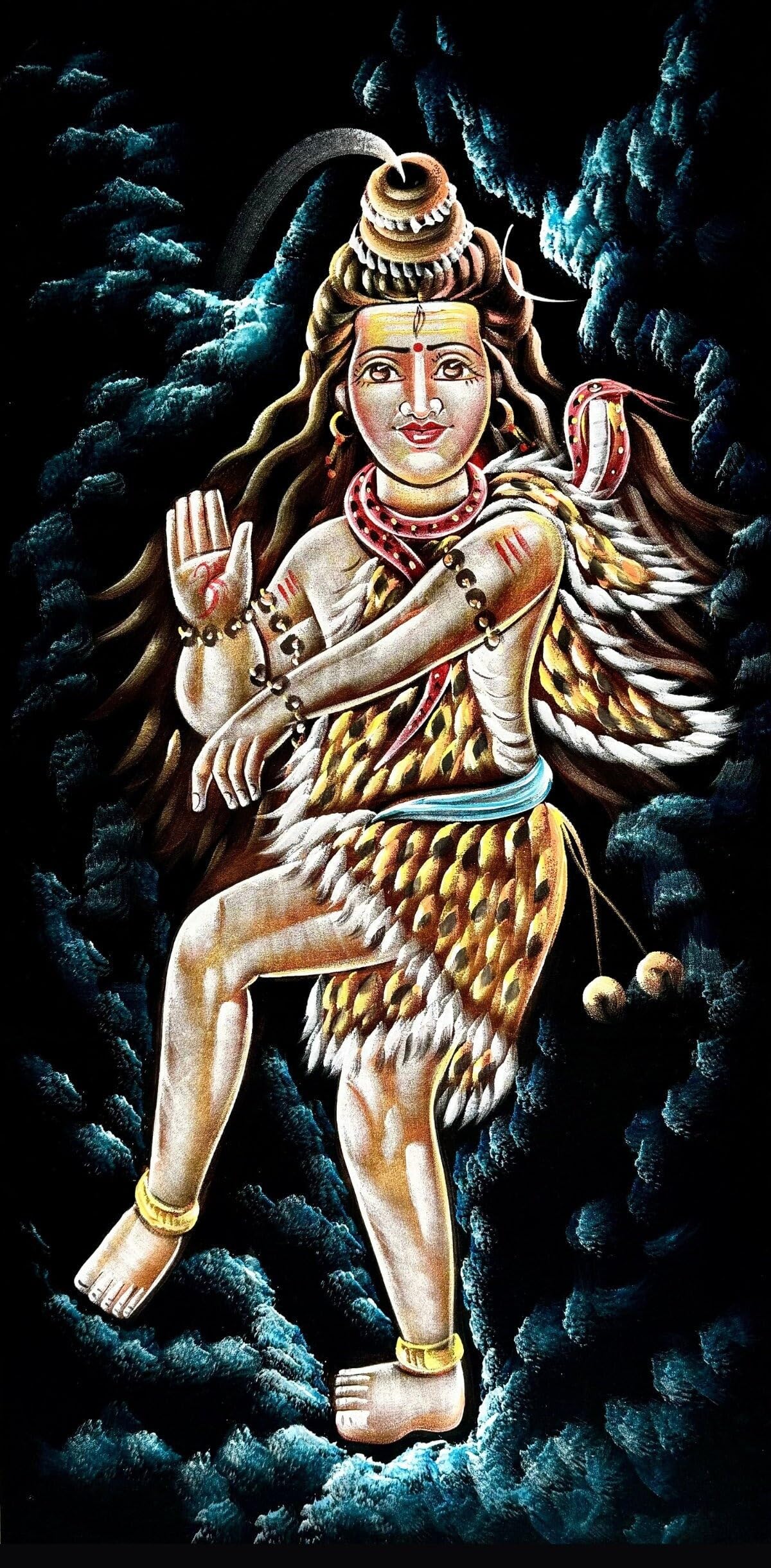 Immerse yourself in the divine energy of traditional Indian art with this striking handmade painting of Lord Shiva, the Nataraja, meticulously crafted on luxurious velvet. This artwork embodies the cosmic dance of Shiva, representing the cycle of creation, preservation, and destruction, integral to Hindu philosophy. The painting vividly captures Lord Shiva in his dynamic Nataraja form, adorned with traditional symbols and surrounded by intricate calligraphy. The powerful imagery of Shiva, with his flowing hair, tiger skin, and poised stance, evokes a sense of spiritual power and tranquility. The detailed calligraphy in the background adds an authentic touch, showcasing ancient Indian script that enhances the overall spiritual significance of the piece. The use of bold colors and meticulous detailing highlights the artist's exceptional skill and dedication to preserving traditional Indian art forms. The velvet canvas provides a rich, textured backdrop that enhances the vibrant colors and intricate details, making the artwork truly stand out. Ideal for spiritual seekers, art collectors, and anyone with an appreciation for traditional Indian art, this piece will add a touch of mystical elegance and cultural depth to any space. Features: Handmade painting on luxurious velvet Intricate symbols and calligraphy Vivid, lasting colors on a rich, textured backdrop A unique blend of spiritual and cultural elements Ideal for private collections, home decor, and spiritual spaces Dimensions: 122x60 cm Materials: Velvet fabric, natural pigments, traditional painting tools Care Instructions: To maintain the beauty and integrity of this velvet painting, avoid exposure to direct sunlight and moisture. Handle with care and clean gently with a soft, dry cloth. Bring home this beautiful piece of traditional Indian art and immerse yourself in the rich spiritual heritage of India.