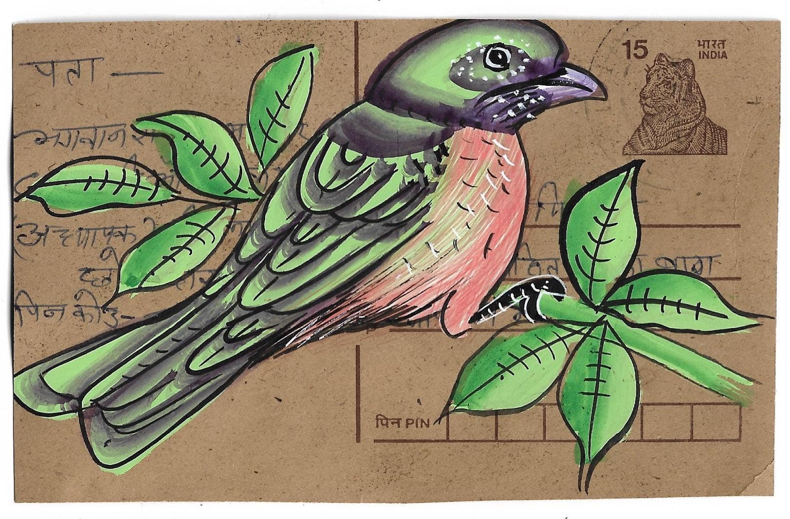 INSAIN - Majestic Birds Paintings on Vintage Postcard Front | Green Bird 2