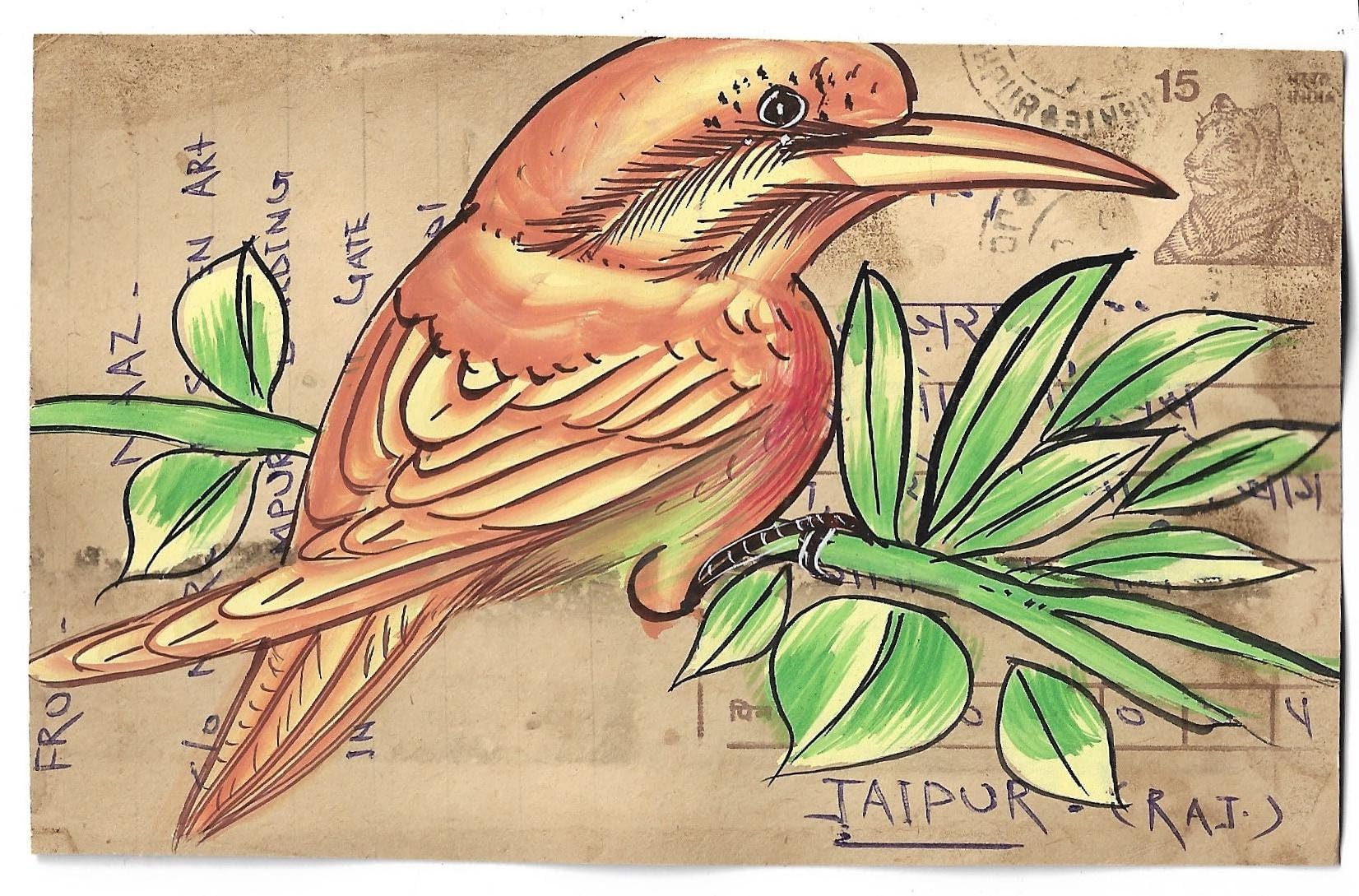 INSAIN - Majestic Birds Paintings on Vintage Postcard Front | Red Bird