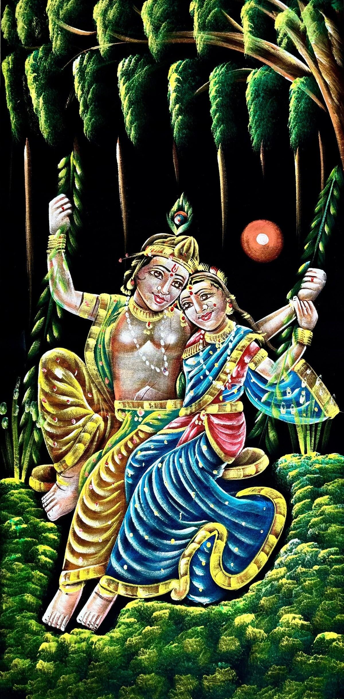 Immerse yourself in the divine love story of Radha and Krishna with our exquisite handmade painting. Capturing the enchanting Ras Leela, this artwork portrays the eternal dance of love between the soul and the divine. Radha's devotion and Krishna's playful flute melodies come alive on the canvas, inviting you to experience their timeless bond. The detailed calligraphy in the background adds an authentic touch, showcasing ancient Indian script that enhances the overall spiritual significance of the piece. The use of bold colors and meticulous detailing highlights the artist's exceptional skill and dedication to preserving traditional Indian art forms. The velvet canvas provides a rich, textured backdrop that enhances the vibrant colors and intricate details, making the artwork truly stand out. Ideal for spiritual seekers, art collectors, and anyone with an appreciation for traditional Indian art, this piece will add a touch of mystical elegance and cultural depth to any space. Display it in your meditation room, living area, or personal sanctuary to evoke a sense of spiritual introspection and cultural richness. Features: Handmade painting on luxurious velvet Intricate symbols and calligraphy Vivid, lasting colors on a rich, textured backdrop A unique blend of spiritual and cultural elements Ideal for private collections, home decor, and spiritual spaces Dimensions: 122x60 cm Materials: Velvet fabric, natural pigments, traditional painting tools Care Instructions: To maintain the beauty and integrity of this velvet painting, avoid exposure to direct sunlight and moisture. Handle with care and clean gently with a soft, dry cloth. Add this exquisite Velvet painting to your collection today and celebrate the timeless beauty of Indian traditional art!