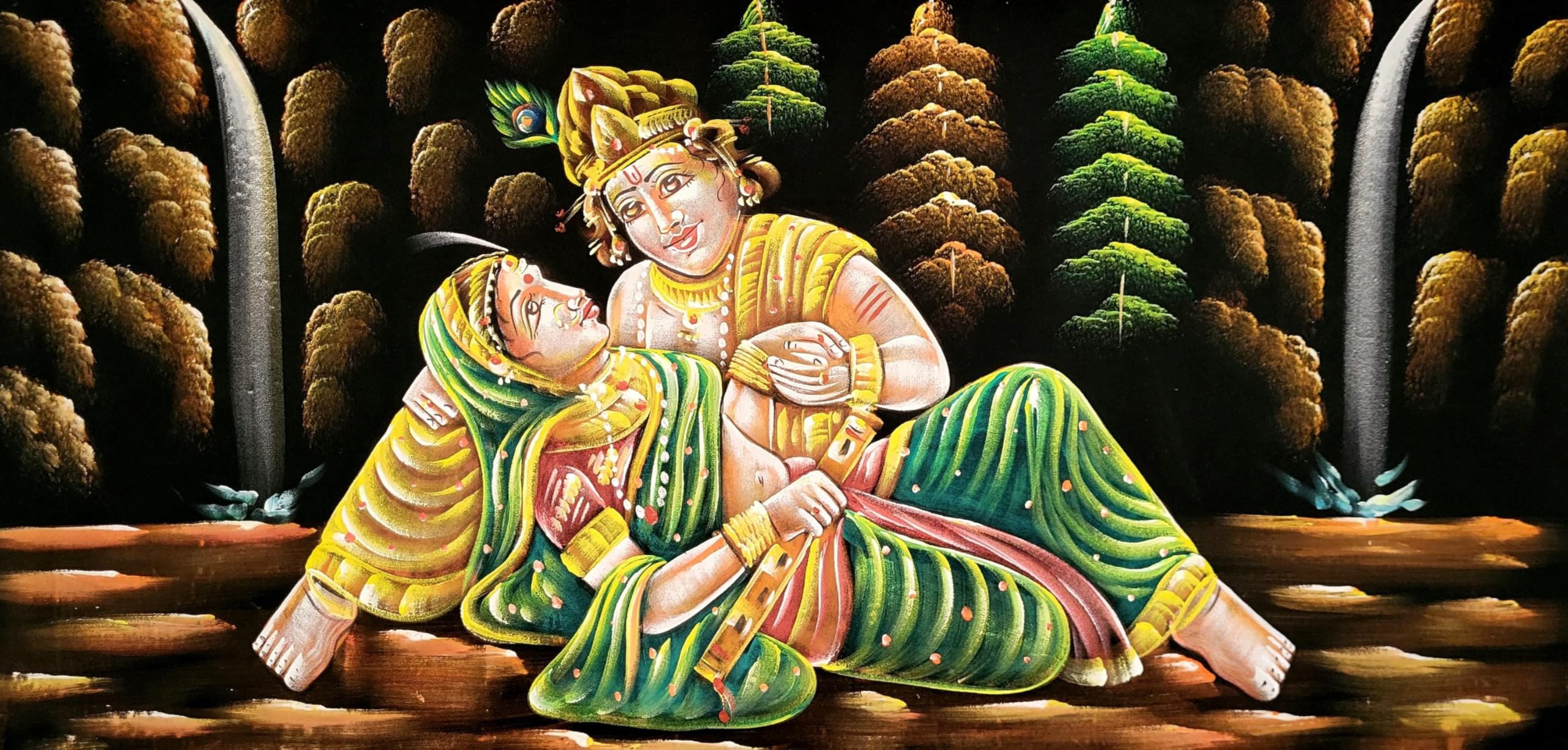 Immerse yourself in the divine love story of Radha and Krishna with our exquisite handmade painting. Capturing the enchanting Ras Leela, this artwork portrays the eternal dance of love between the soul and the divine. Radha's devotion and Krishna's playful flute melodies come alive on the canvas, inviting you to experience their timeless bond. The detailed calligraphy in the background adds an authentic touch, showcasing ancient Indian script that enhances the overall spiritual significance of the piece. The use of bold colors and meticulous detailing highlights the artist's exceptional skill and dedication to preserving traditional Indian art forms. The velvet canvas provides a rich, textured backdrop that enhances the vibrant colors and intricate details, making the artwork truly stand out. Ideal for spiritual seekers, art collectors, and anyone with an appreciation for traditional Indian art, this piece will add a touch of mystical elegance and cultural depth to any space. Display it in your meditation room, living area, or personal sanctuary to evoke a sense of spiritual introspection and cultural richness. Features: Handmade painting on luxurious velvet Intricate symbols and calligraphy Vivid, lasting colors on a rich, textured backdrop A unique blend of spiritual and cultural elements Ideal for private collections, home decor, and spiritual spaces Dimensions: 122x60 cm Materials: Velvet fabric, natural pigments, traditional painting tools Care Instructions: To maintain the beauty and integrity of this velvet painting, avoid exposure to direct sunlight and moisture. Handle with care and clean gently with a soft, dry cloth. Add this exquisite Velvet painting to your collection today and celebrate the timeless beauty of Indian traditional art!