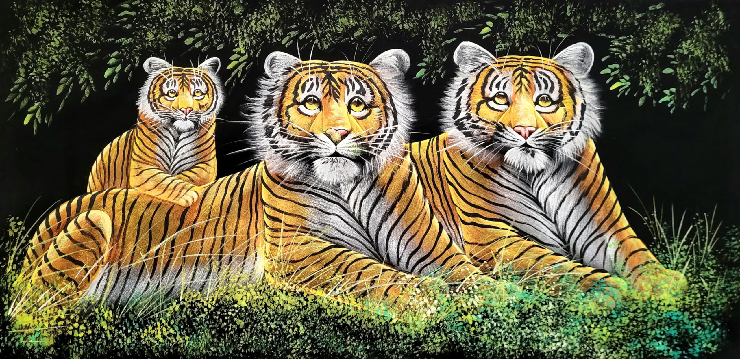 Immerse yourself in the majestic beauty of the wild with this stunning handmade velvet painting depicting a serene tiger family. This artwork captures the essence of wildlife with a mother tiger and her cubs resting amidst lush greenery and a tranquil night sky. The painting is meticulously crafted on luxurious velvet, enhancing the rich colors and intricate details of the tigers' fur and the natural surroundings. The vibrant hues and lifelike portrayal bring the scene to life, making it a captivating piece for any wildlife enthusiast or art lover. Perfect for adding a touch of nature to your living space, this piece can be a focal point in your living room, study, or any space where you seek a connection with the natural world. It serves as a reminder of the beauty and harmony of wildlife, offering a sense of tranquility and admiration for these magnificent creatures. Features: Handmade painting on high-quality velvet Detailed depiction of a tiger family in a natural setting Vibrant colors and intricate details on a rich, textured backdrop Ideal for nature-themed and wildlife-inspired spaces Unique blend of traditional art and wildlife elements Dimensions: Height: 60 cm Width: 122 cm Materials: Velvet fabric Natural pigments Traditional painting tools Care Instructions: To maintain the beauty and integrity of this velvet painting, avoid exposure to direct sunlight and moisture. Handle with care and clean gently with a soft, dry cloth. Bring home this beautiful piece of wildlife art and let the majestic presence of the tiger family enrich your living space. This handcrafted velvet painting is a testament to traditional Indian artistry and the awe-inspiring beauty of nature, making it a cherished addition to your collection.