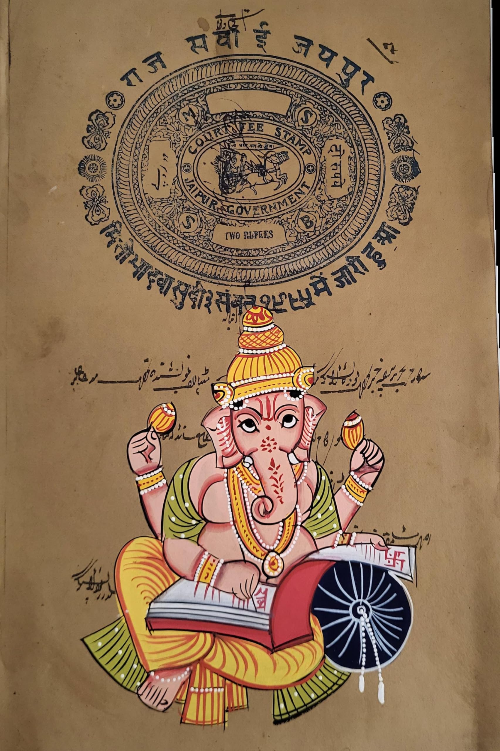 INSAIN - Traditional Indian Painting of Lord Ganesh with Jaipur Government Seal | Vintage stamp paper | Antique Wall Art