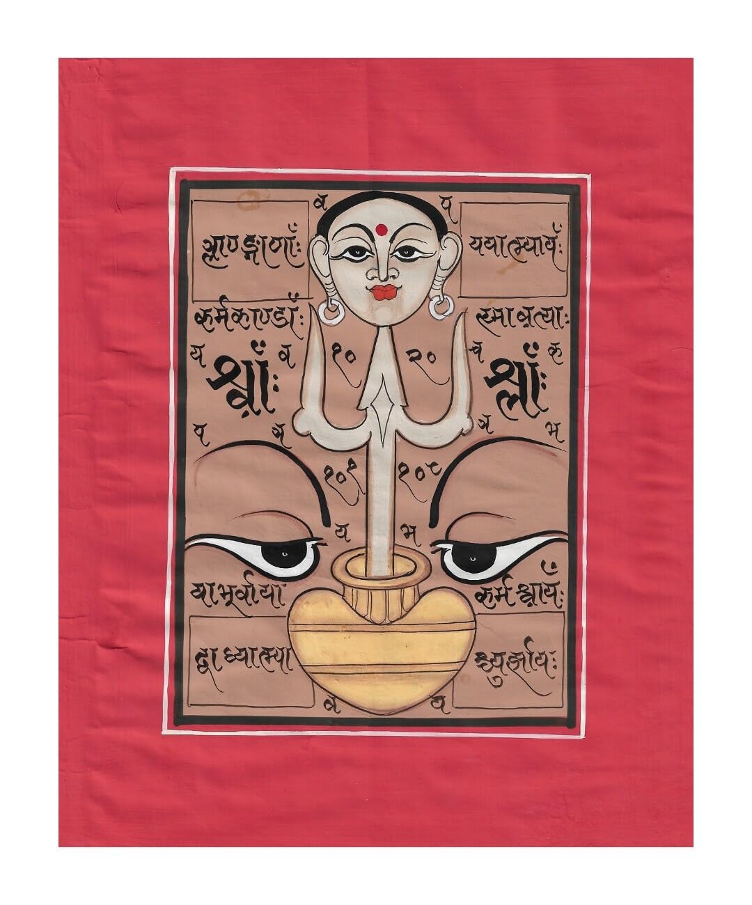Discover the mystical allure of traditional Indian tantric art with this captivating painting. This artwork is a profound representation of tantric symbols intertwined with intricate calligraphy, reflecting the deep spiritual and philosophical traditions of India. The painting prominently features a central tantric figure adorned with symbolic elements that are deeply rooted in Indian spiritual practices. The detailed calligraphy surrounding the figure adds a layer of depth and authenticity, showcasing ancient Indian script that enhances the overall spiritual significance of the piece. The vivid colors and meticulous detailing highlight the artist's exceptional skill and dedication to preserving traditional Indian art forms. This painting is not just an aesthetic masterpiece but also a spiritual conduit, offering a glimpse into the profound world of tantric practices. Ideal for spiritual seekers, art collectors, and anyone with an appreciation for traditional Indian art, this piece will add a touch of mystical elegance and cultural depth to any space. Display it in your meditation room, living area, or personal sanctuary to evoke a sense of spiritual introspection and cultural richness. Features: Hand-painted with intricate tantric symbols and calligraphy Vivid, lasting colors A unique blend of spiritual and cultural elements Ideal for private collections, home decor, and spiritual spaces Dimensions: 9*6.5 inch Materials: Traditional paper, natural pigments, traditional painting tools Care Instructions: To maintain the beauty and integrity of this painting, avoid exposure to direct sunlight and moisture. Handle with care and clean gently with a soft, dry cloth. Bring home this beautiful piece of traditional Indian tantric art and immerse yourself in the rich spiritual heritage of India. This handcrafted painting is sure to be a cherished addition to your collection, symbolizing the profound philosophical and artistic traditions of Indian culture.