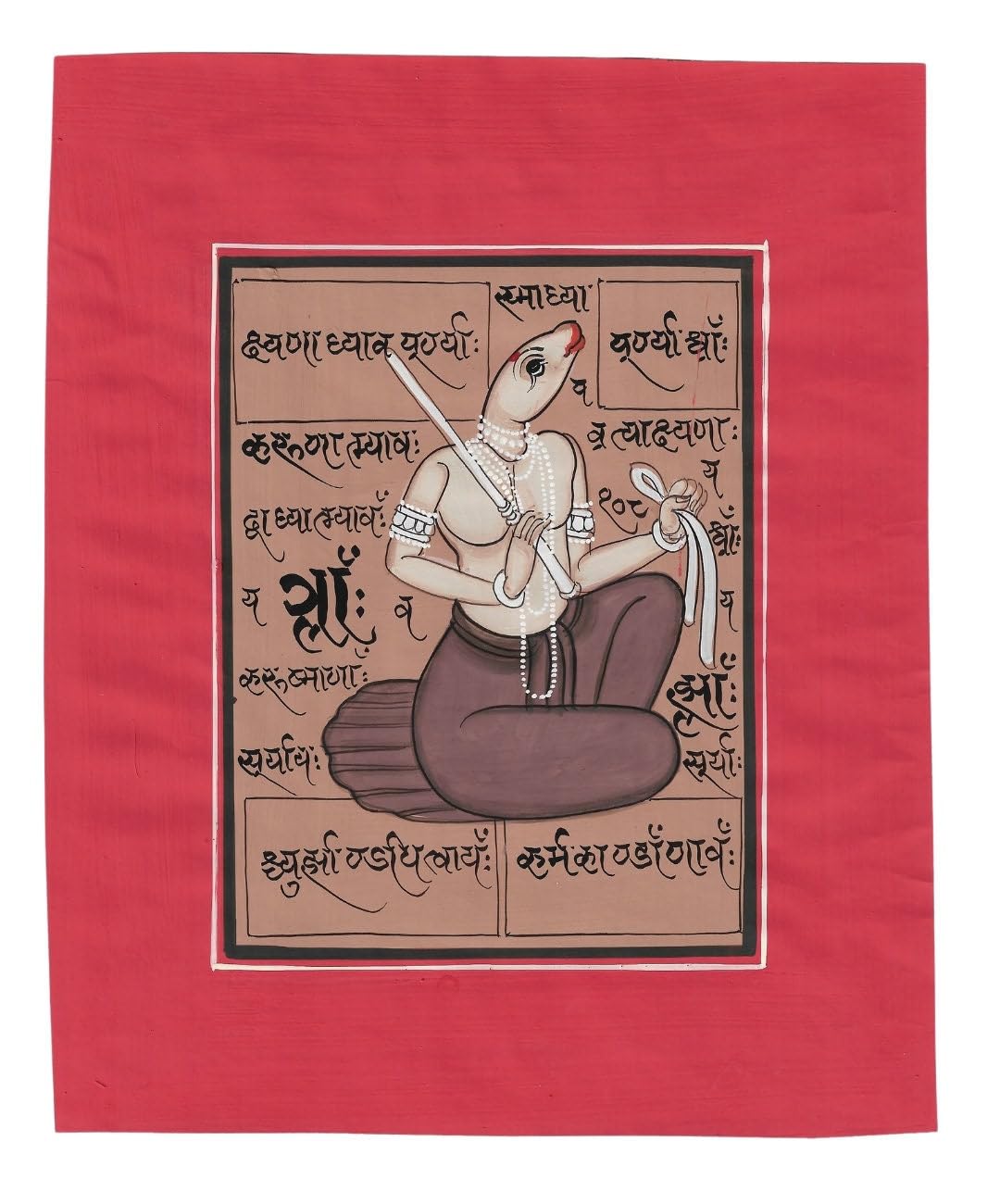 Discover the mystical allure of traditional Indian tantric art with this captivating painting. This artwork is a profound representation of tantric symbols intertwined with intricate calligraphy, reflecting the deep spiritual and philosophical traditions of India. The painting prominently features a central tantric figure adorned with symbolic elements that are deeply rooted in Indian spiritual practices. The detailed calligraphy surrounding the figure adds a layer of depth and authenticity, showcasing ancient Indian script that enhances the overall spiritual significance of the piece. The vivid colors and meticulous detailing highlight the artist's exceptional skill and dedication to preserving traditional Indian art forms. This painting is not just an aesthetic masterpiece but also a spiritual conduit, offering a glimpse into the profound world of tantric practices. Ideal for spiritual seekers, art collectors, and anyone with an appreciation for traditional Indian art, this piece will add a touch of mystical elegance and cultural depth to any space. Display it in your meditation room, living area, or personal sanctuary to evoke a sense of spiritual introspection and cultural richness. Features: Hand-painted with intricate tantric symbols and calligraphy Vivid, lasting colors A unique blend of spiritual and cultural elements Ideal for private collections, home decor, and spiritual spaces Dimensions: 9*6.5 inch Materials: Traditional paper, natural pigments, traditional painting tools Care Instructions: To maintain the beauty and integrity of this painting, avoid exposure to direct sunlight and moisture. Handle with care and clean gently with a soft, dry cloth. Bring home this beautiful piece of traditional Indian tantric art and immerse yourself in the rich spiritual heritage of India. This handcrafted painting is sure to be a cherished addition to your collection, symbolizing the profound philosophical and artistic traditions of Indian culture.