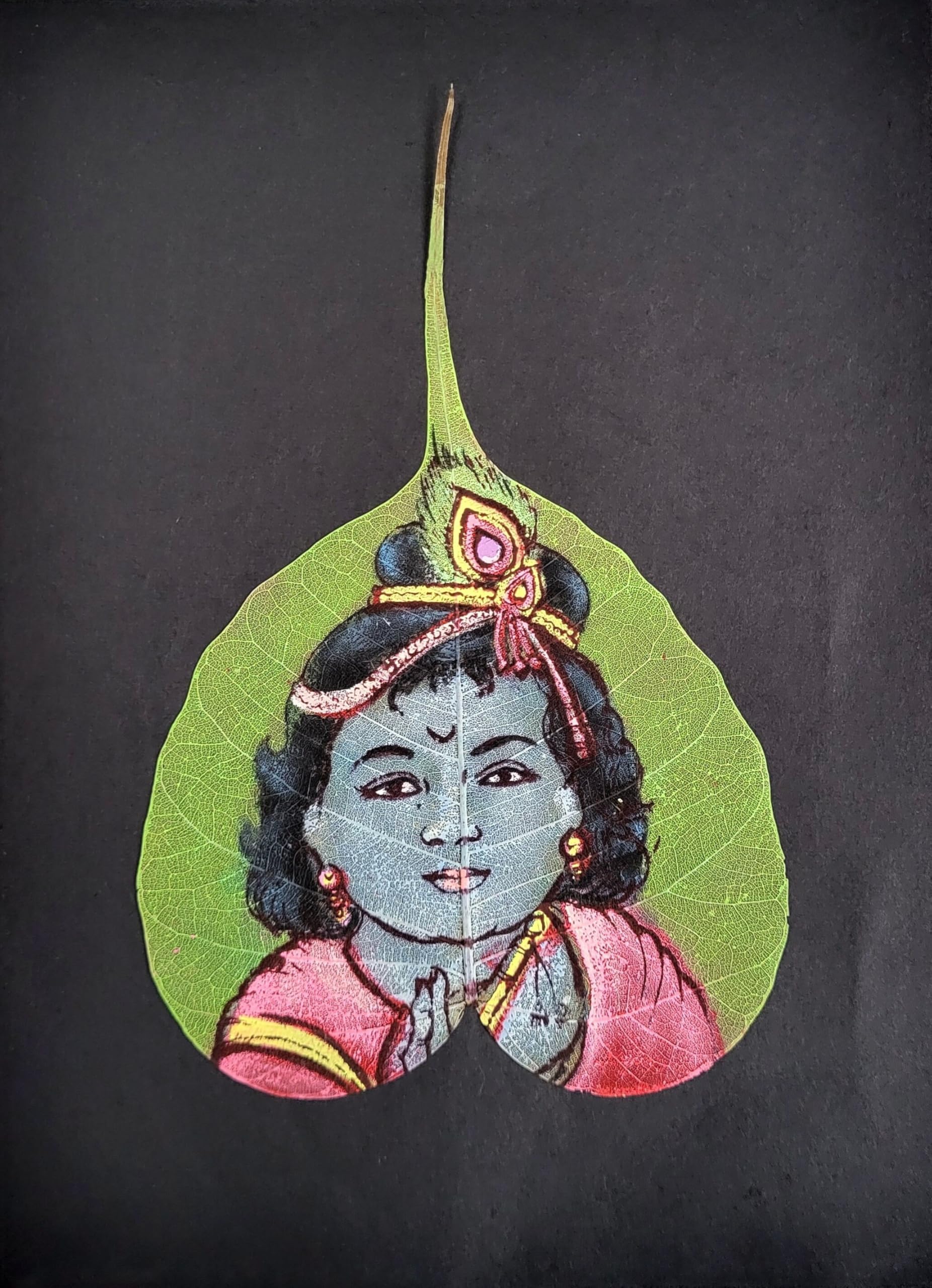 Immerse yourself in the spiritual aura of Lord Krishna with our exquisite handmade painting. On this natural leaf canvas, Krishna's divine form emergesâthe peacock feather in his hair, the enchanting flute in his hand. His playful gaze invites you to join the cosmic dance of creation. This unique artwork celebrates devotion and the eternal melody of Krishna's love, painted meticulously on a natural Pipal leaf. The delicate brushwork and vibrant colors bring out the essence of love and tradition, making it a unique addition to any art collection or home decor. Crafted by skilled artisans, this leaf painting highlights the rich heritage and intricate artistry of India. The natural texture of the Pipal leaf adds an extra layer of depth and authenticity to the piece, making it a truly one-of-a-kind artwork. The traditional attire and tender expressions capture the essence of Indian romance and cultural beauty. This artwork is perfect for those who appreciate unique, handcrafted items that tell a story of cultural significance. It makes a wonderful gift for art lovers, collectors, or anyone looking to add a touch of ethnic elegance to their space. Display it in your living room, bedroom, or gallery to evoke a sense of timeless beauty and romance. Features: Hand-painted on a natural Pipal leaf Detailed portrait of Lord Krishna Vibrant, lasting colors Unique blend of nature and art Ideal for home decor, gifts, and art collections Dimensions: 9*6.5 inch Materials: Pipal leaf, natural pigments, traditional painting tools Care Instructions: To preserve the beauty of this delicate leaf painting, keep it away from direct sunlight and moisture. Handle with care and clean gently with a soft, dry cloth. Add this exquisite leaf painting to your collection today and celebrate the timeless beauty of Indian traditional art! Note- It is an unframed painting. Frame is just for reference and it is not included.