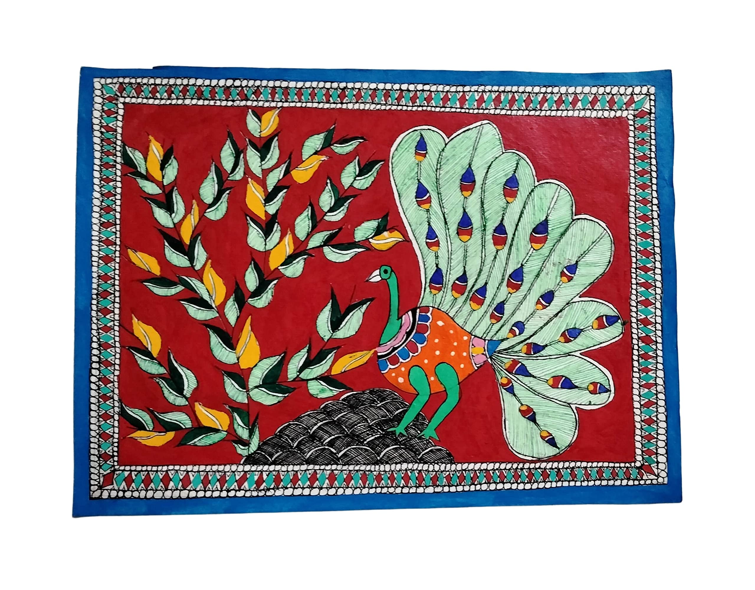 MADHUBANI PAINTINGS MADHUBANI PAINTING- MITHILA PAINTING OF PEACOCK- HANDMADE-(15 X 11 INCH)-UNFRAMED