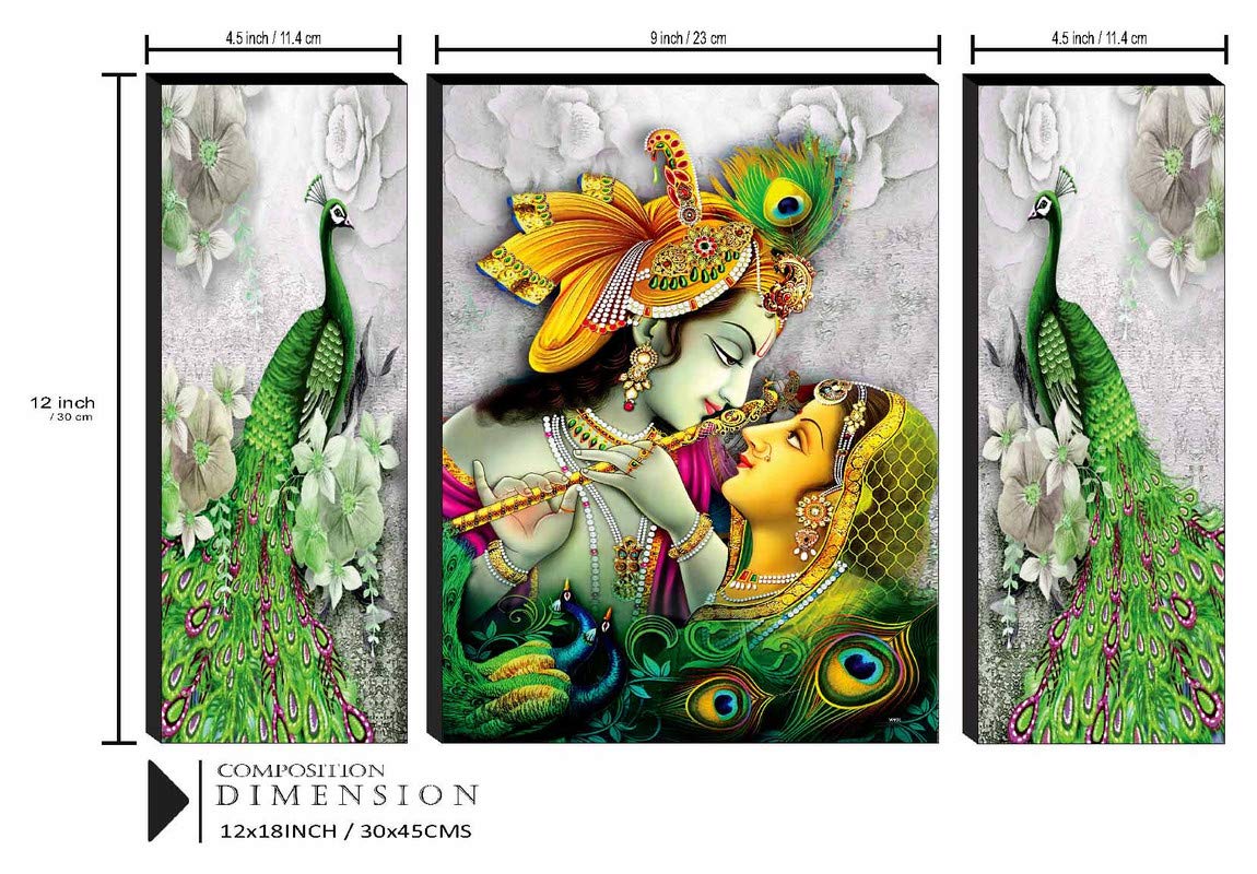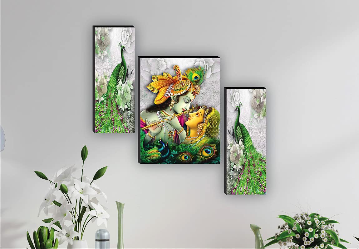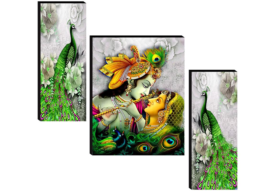 SAF paintings SAF-JM31085 Radha Krishna with couple peacock wall painting Wood home decor items paintings for living room with frame wall decor painting (12 inch X 18 inch, Multicolour) -Set of 3