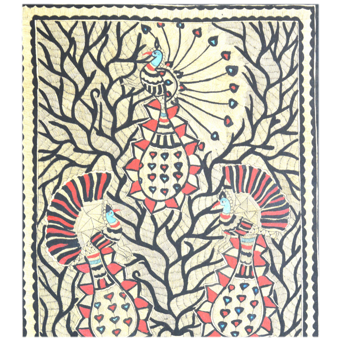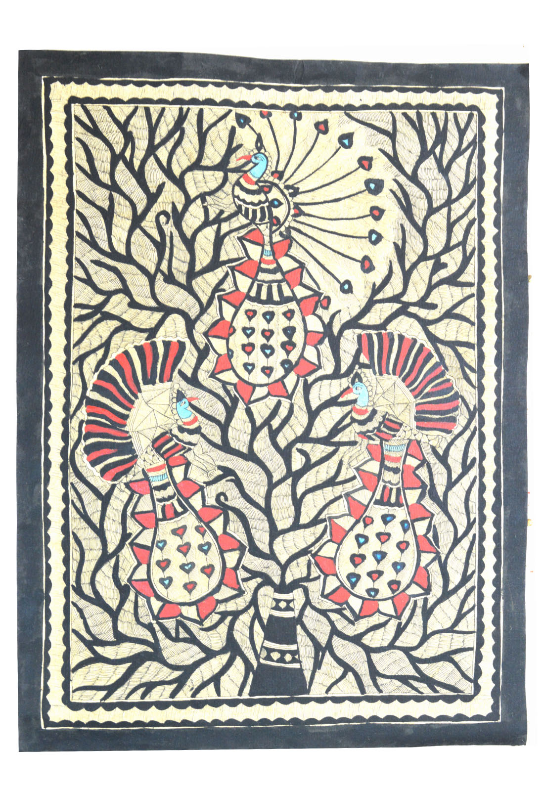 An illusion forming marvellous traditional Madhubani painting extensively detailing the 'tree of life' with various creatures embedded in it depicting harmony, these are composed with such ingenuity that one can only perceive them if one looks closely. The strokes of the painting quill are very fine but distinct. These paintings are inspired by folklore. Only hand made paper cured with cow dung is utilized and is a  signature livelihood of the painters of Madhubani, Bihar, India.