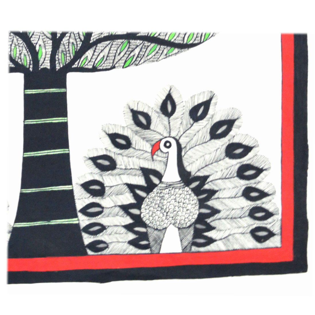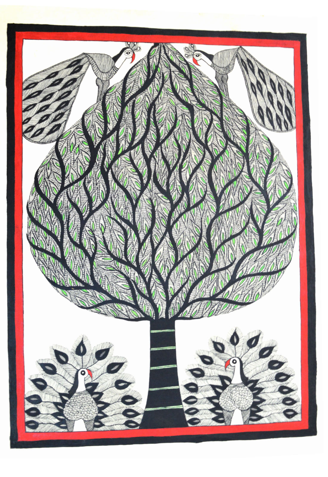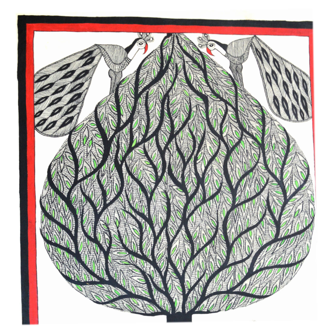 An illusion forming marvellous traditional Madhubani painting extensively detailing the 'tree of life' with various creatures embedded in it depicting harmony, these are composed with such ingenuity that one can only perceive them if one looks closely. The strokes of the painting quill are very fine but distinct. These paintings are inspired by folklore. Only hand made paper cured with cow dung is utilized and is a signature livelihood of the painters of Madhubani, Bihar, India.