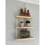 Handmade 3 tier wall hanging shelving. This is an example of small natural pine shelves with white cords.