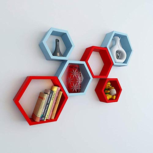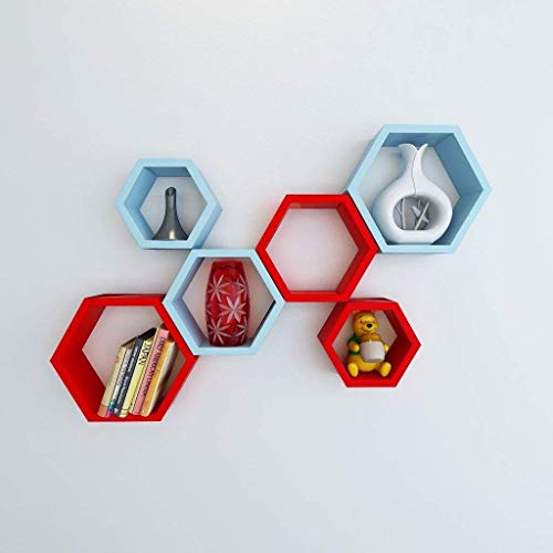 MDF Hexagon Shape Floating Wall Shelves - Set of 6 (Red & Sky Blue)