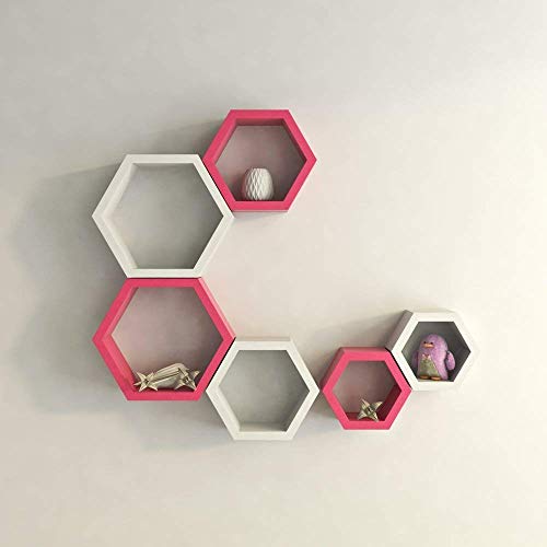 MDF Hexagon Shape Floating Wall Shelves - Set of 6 (White & Pink)