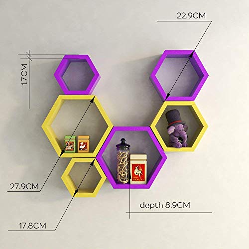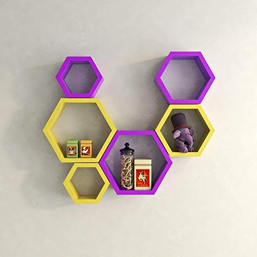 MDF Hexagon Shape Floating Wall Shelves - Set of 6 (Yellow & Purple)