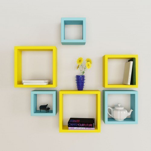 Wall Mount Shelves Square Shape Set of 6 Wall Shelves -Yellow & Sky Blue
