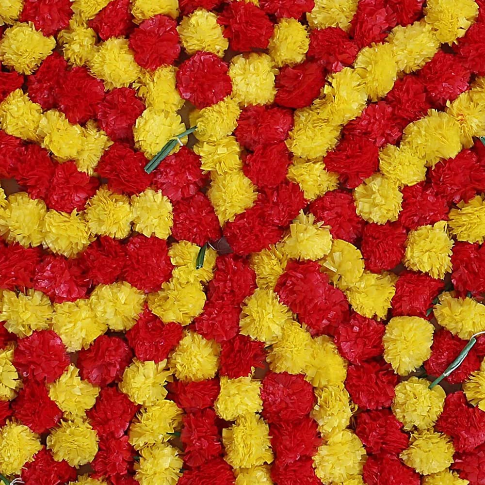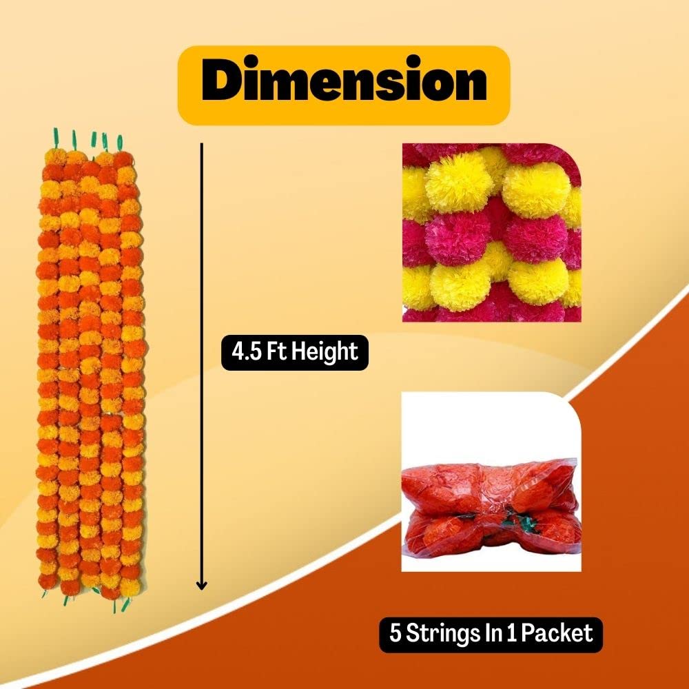 Artificial Marigold Fluffy Flowers String Garlands for Diwali Home Festival Decoration Artificial Flowers Garlands for Door Wall Hanging - 5 String (Yellow-Orange)