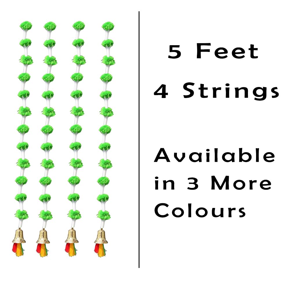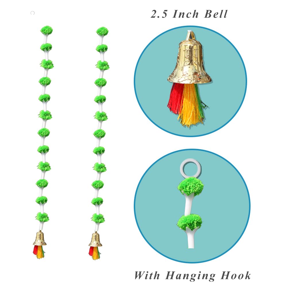 Festive Vibes Artificial (Tuberose) Handicrafts Woolen Pom Pom Green Hanging Golden Colour Bell Torans Strings for Wall Door Decoration of Home Balcony Hall ganpati Backdrop 5 ft - Pack of 12 (Green)
