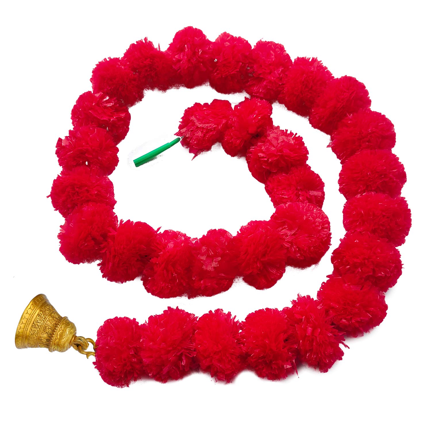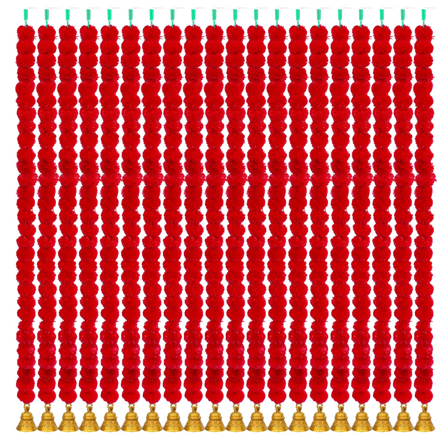 iHandikart Handmade Decorative Marigold Artificial Fluffy Garland with Bell in The Bottom Size 60x2.5 inches Used for Office Home Diwali Decoration| Red Colour (Pack of 20)