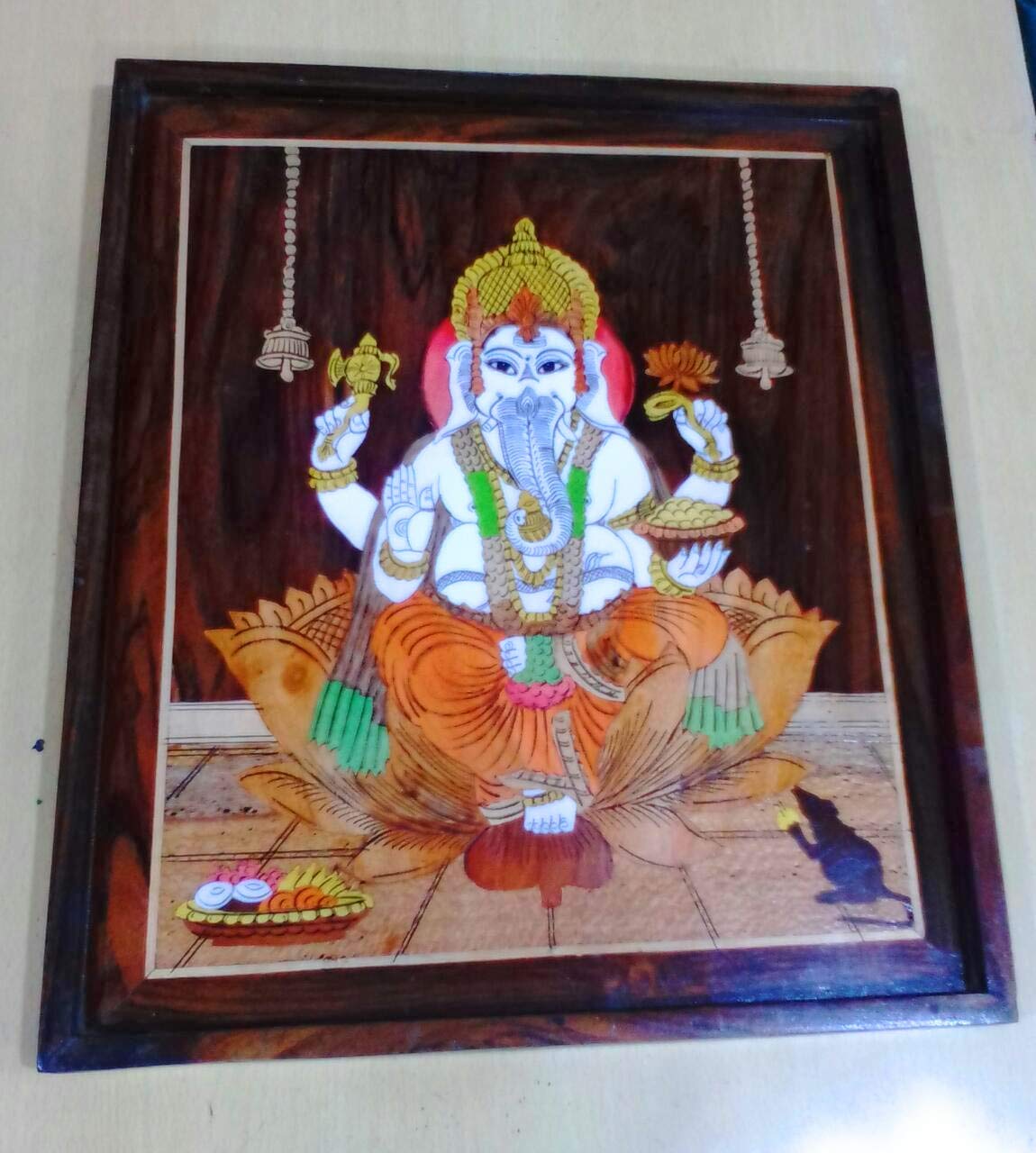 MARBLE INLAY ART AGRA - PACCHIKARI wooden inlay work wall hanging ganesha image Karnataka Handicraft size 16x19 inch.