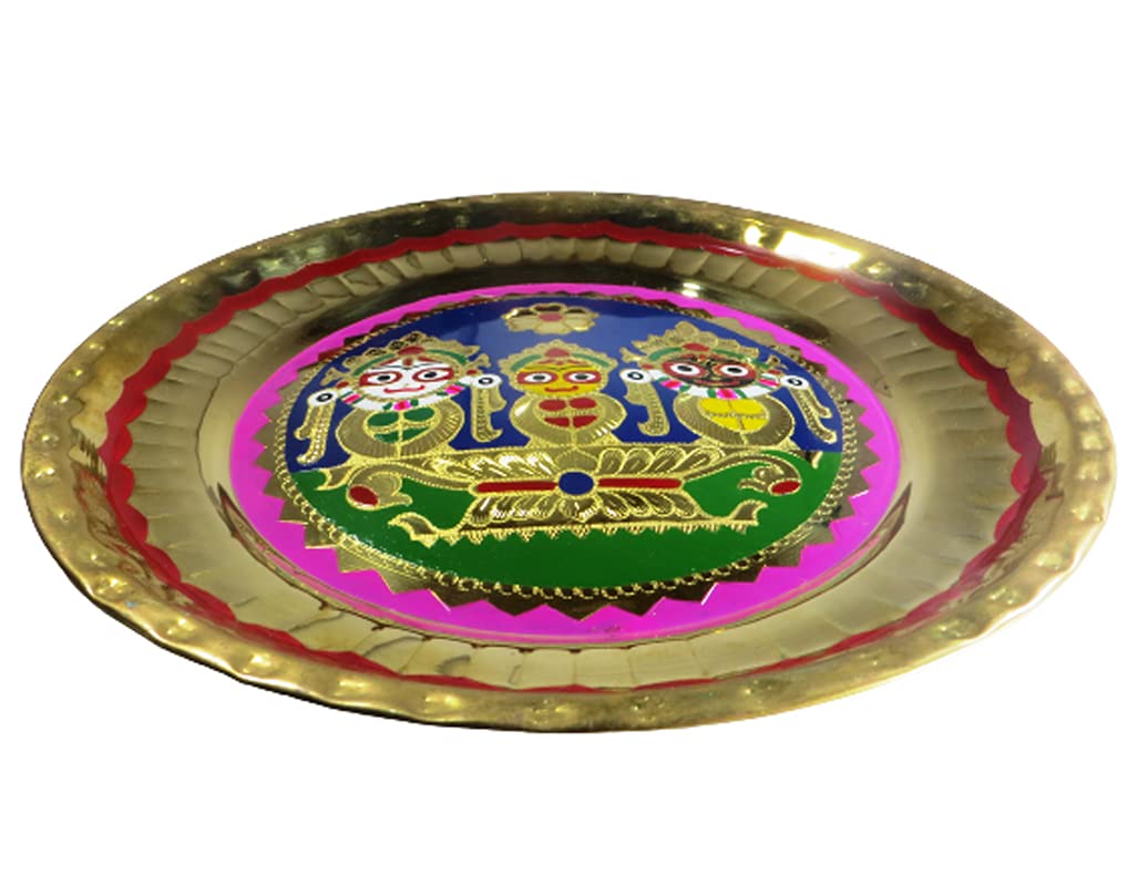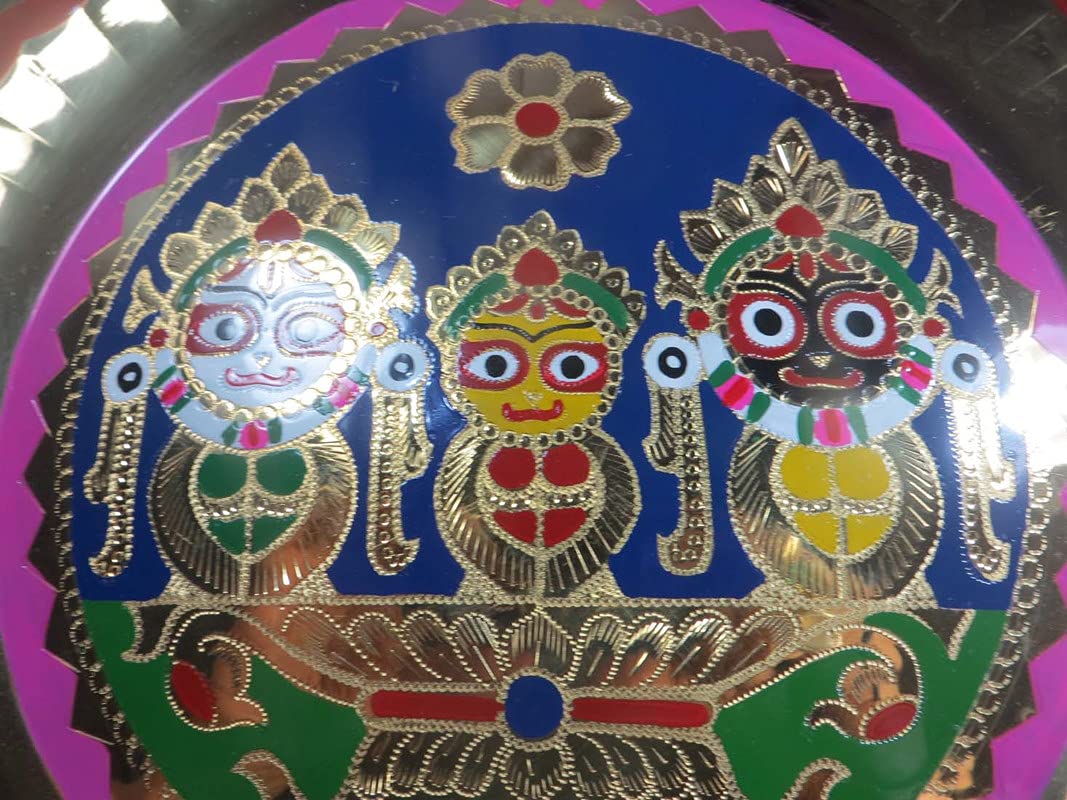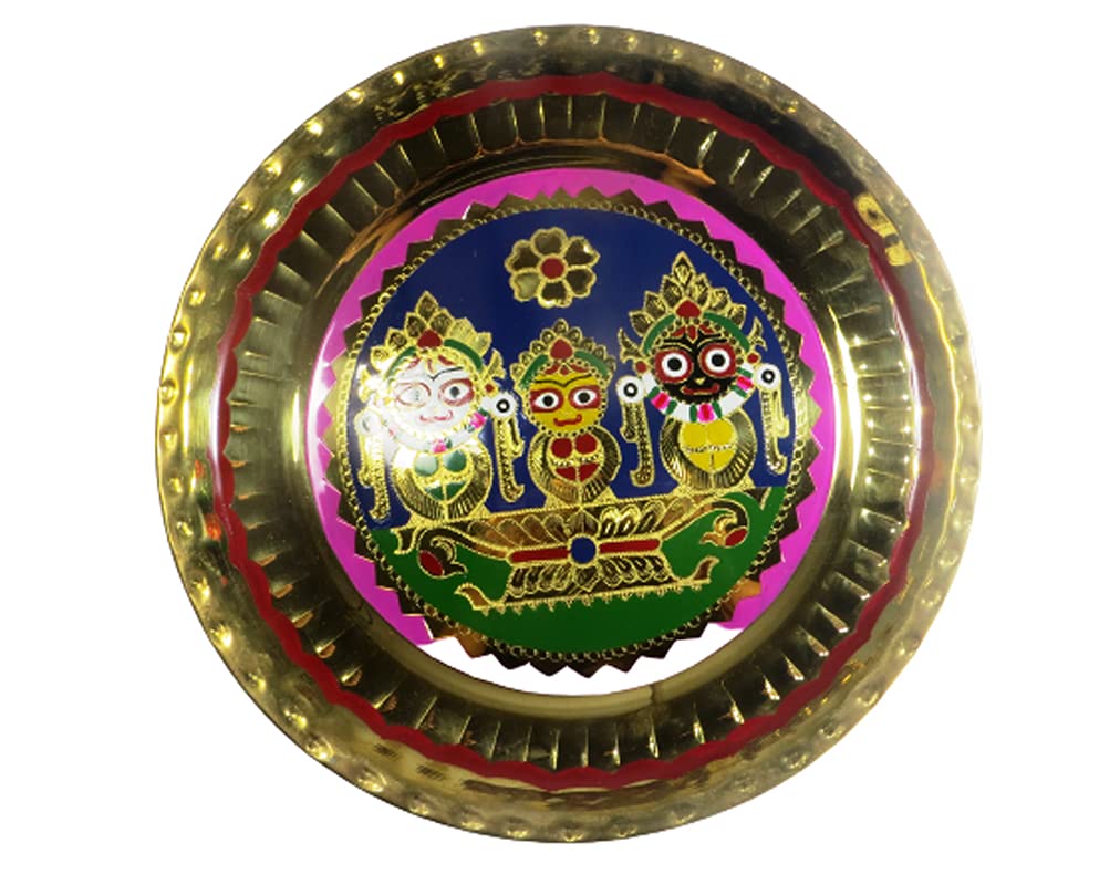 WOOD CARVING WORK Hand-painted Decorative Brass Wall Hanging Plate with Lord Jagannath Balabhadra and Subhadras picture (11.5 inches in diameter and about 380 grams in weight) ideal for wall dcor in living rooms temples office spaces business spaces restaurants and for gifting purposes