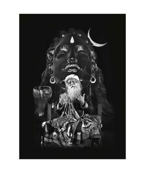 Raghu Rai captures the intensity which is vividly displayed in this poster with Sadhguru in front of the majestic Adiyogi.