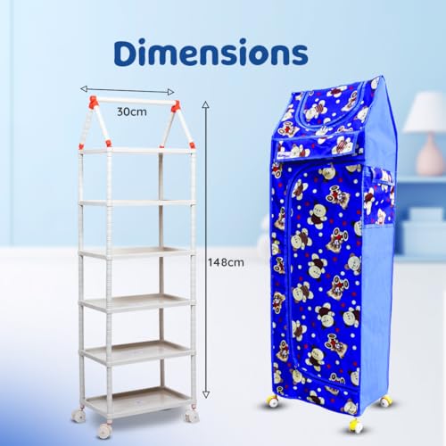 BUMTUM Baby Wardrobe Multipurpose 6 Shelve |Foldable Almirah| Baby Wardrobe for Clothes Storage | Baby Wardrobe Cover | Baby Wardrobe Wheels (Teddy Print Blue)