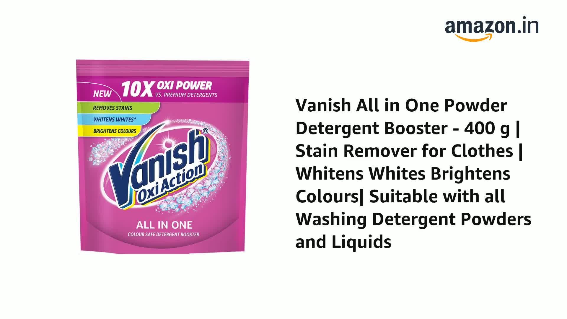 Only detergents are not enough for removing tough stains and most of the times the stain remains on the clothes even after a wash with detergent. Get enhanced cleaning first time every time with Vanish- Expert Stain Removal Laundry Additive. With its advance oxygen power Vanish removes even the toughest dried-on stains ensuring a stain-free laundry. The powder is absolutely safe to be used on both coloured and white clothes. Vanish is an expert laundry additive and spot cleaner that specializes in removal of tough stains in only 1 wash with its active oxygen formula. It also whitens your whites and brightens your coloured garments with its active brighteners to give you dry clean like results for your everyday clothes. Safety info: Important: Ensure that you follow the usage instructions on the package of Vanish. Do not use on leather silk or wool. Do not use on surfaces that are finished or coated for instance woods metals etc.