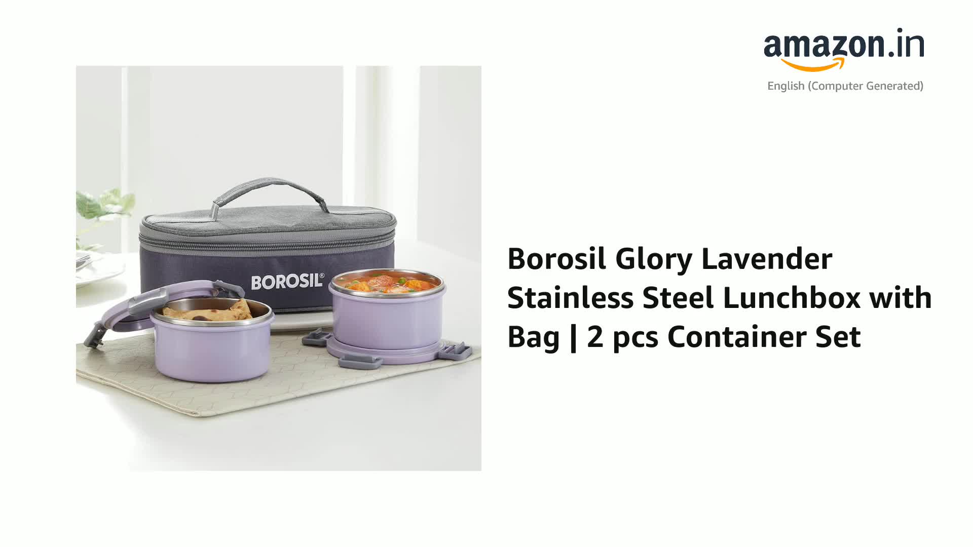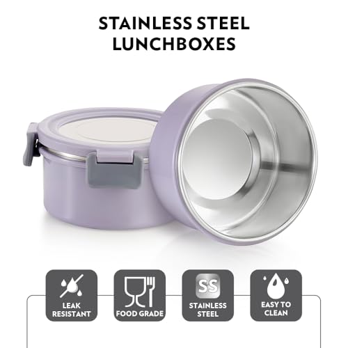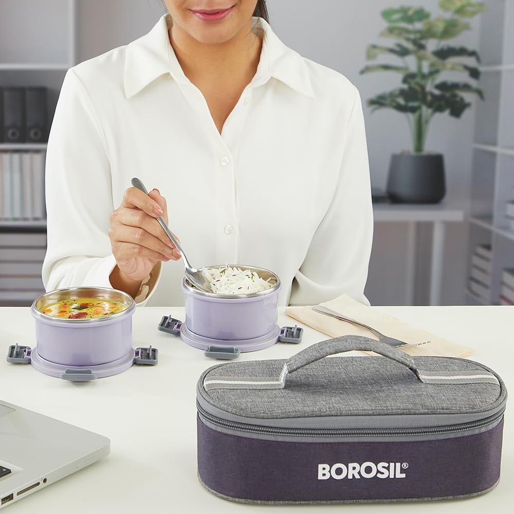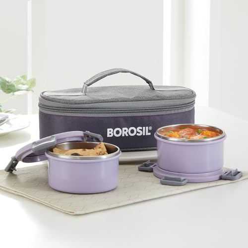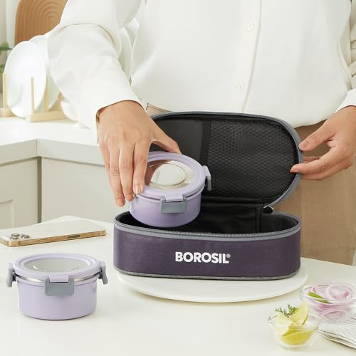 Borosil Glory Lavender Stainless Steel Lunchbox with Bag | 2 pcs Container Set (280ml Each) | Microwavable Tiffin with Food Grade Steel | Leakproof & Dishwasher Safe | 1 Year Warranty | Horizontal